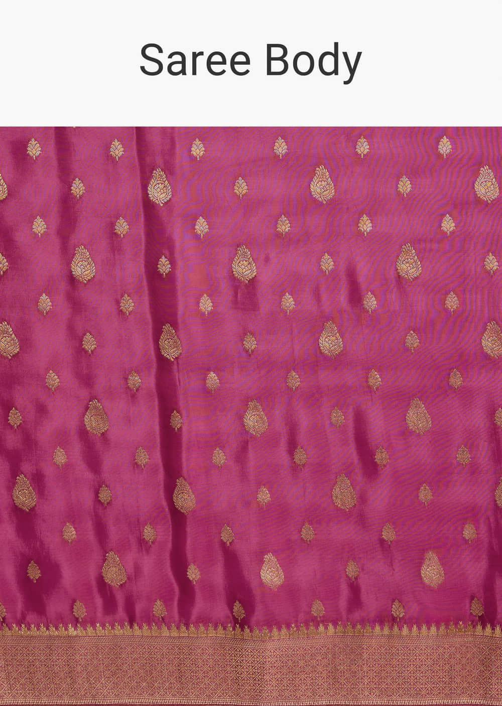 Tasteful and timeless, this wine dola silk woven saree runs a golden zari pattern along the border, scatters tiny butti across the body and saves the richest weave for the... More Product Details