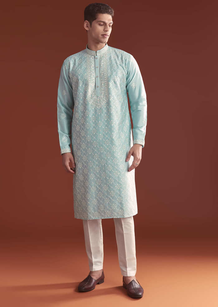 Aqua Blue Silk Kurta Set For Men With Hand Embroidery And Floral Print