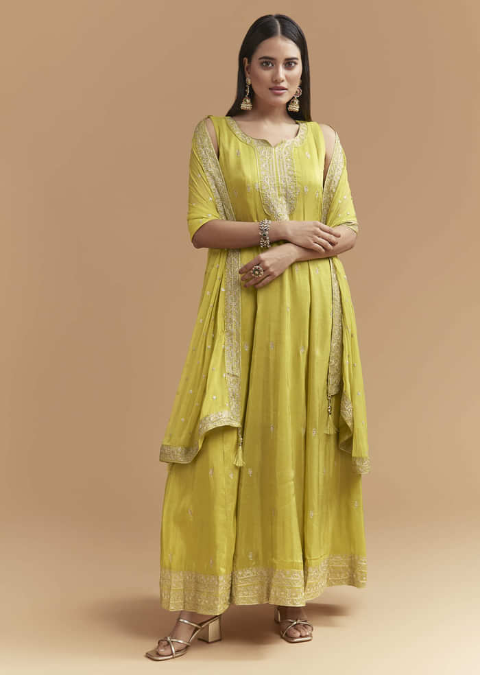 Lime Green Chinon Kurta Sharara Set With Choker Dupatta