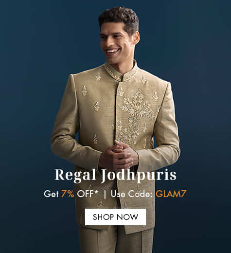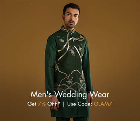 - Sangeet Dress For Men- Classic bandhgalas, thread work kurtas or floral work kurta pyjama set at KALKI can amp up your sangeet look. You can opt for plain, solid-coloured patterns, prints or edgy styles to make it all Insta-worthy.