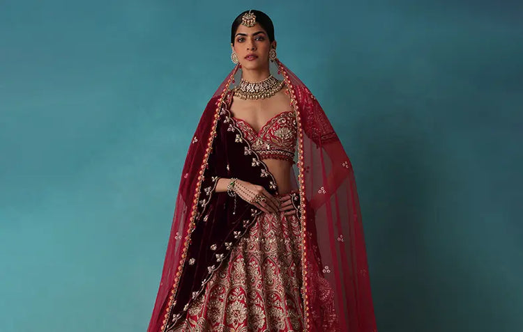 Wine Red Queenly Bridal Lehenga In Velvet With Heavy Floral Embroidery - NOOR 2022