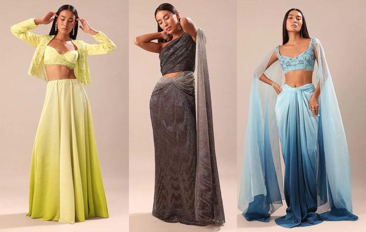 Discover curated edits of indo western clothing crafted for every celebration and mood. From mirror work lehengas to metallic saree gowns, every outfit brings festive glam to life. Explore indo-western saree drapes that blend modern silhouettes with timeless fabrics.