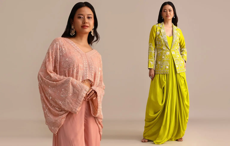 Float through the festivities with cape style indo western dresses layered in embellished capes and intricate embroidery. Cape overlays transform simple silhouettes into absolute show-stoppers. Designed for the woman who walks into a room and owns it instantly.