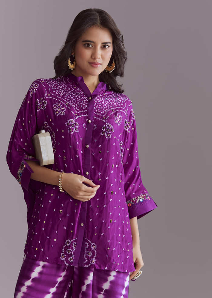 Purple Silk Co-Ord Set With Authentic Bandhani And Leheriya Print