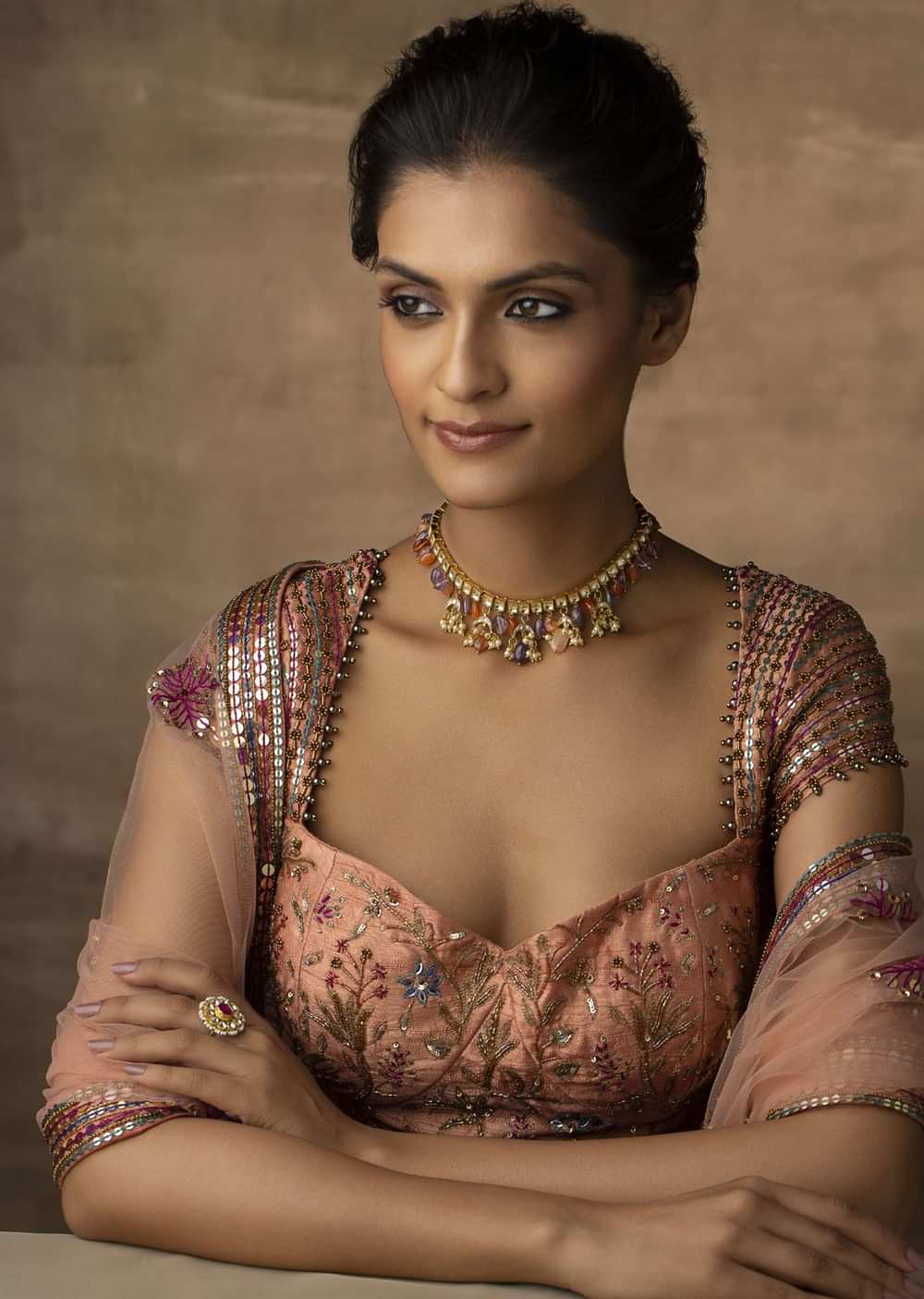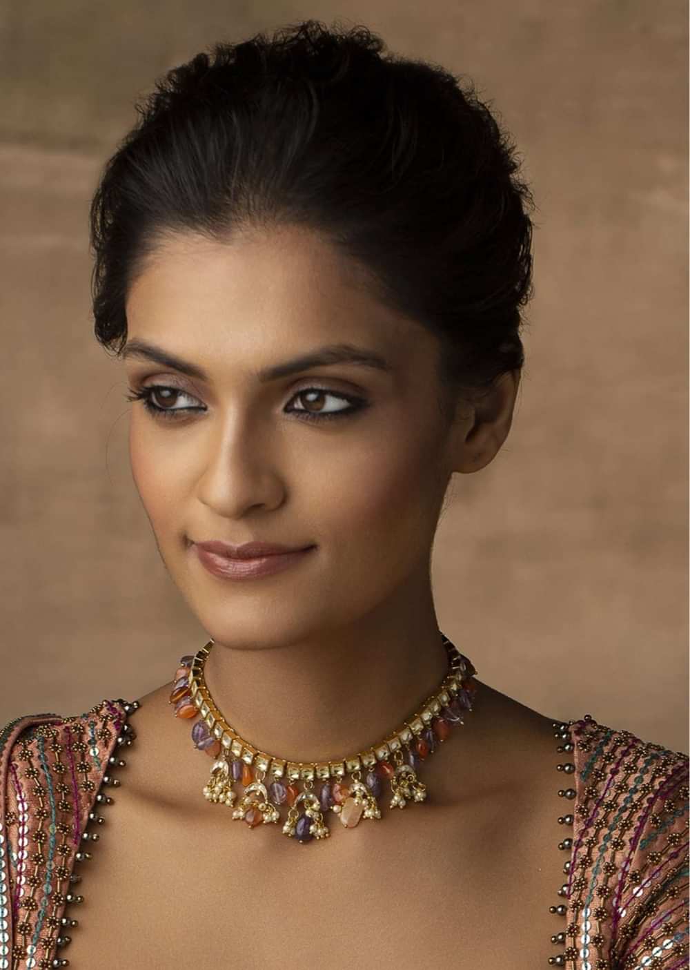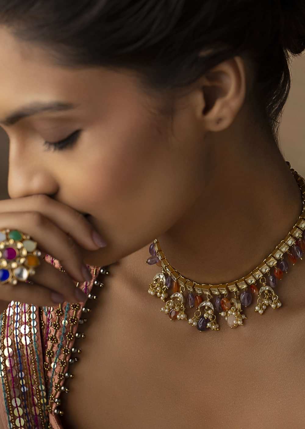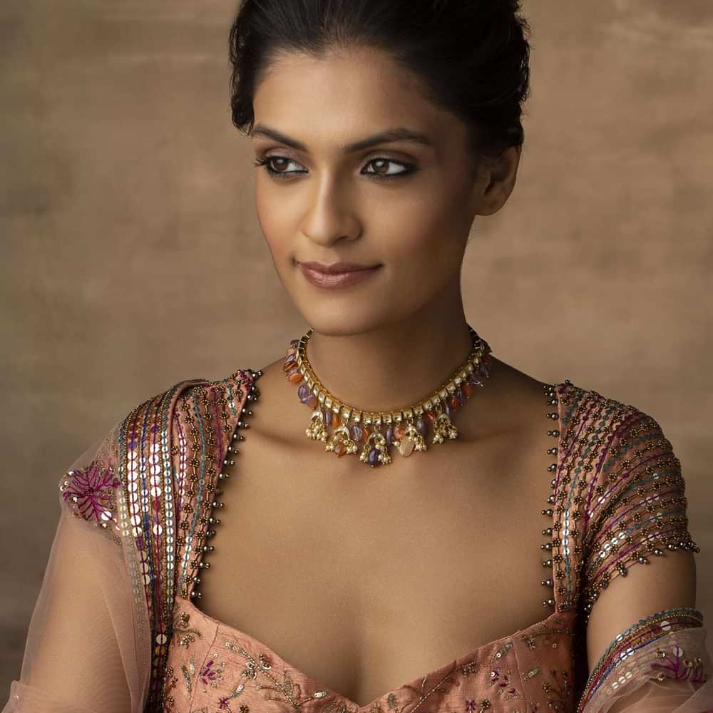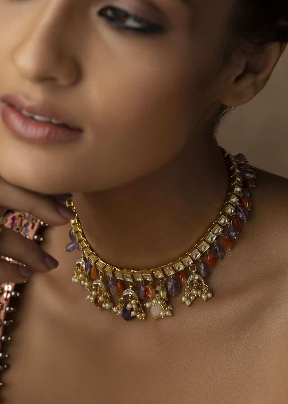 - A symphony of pearls and kundan, this necklace showcases a captivating blend of colors.