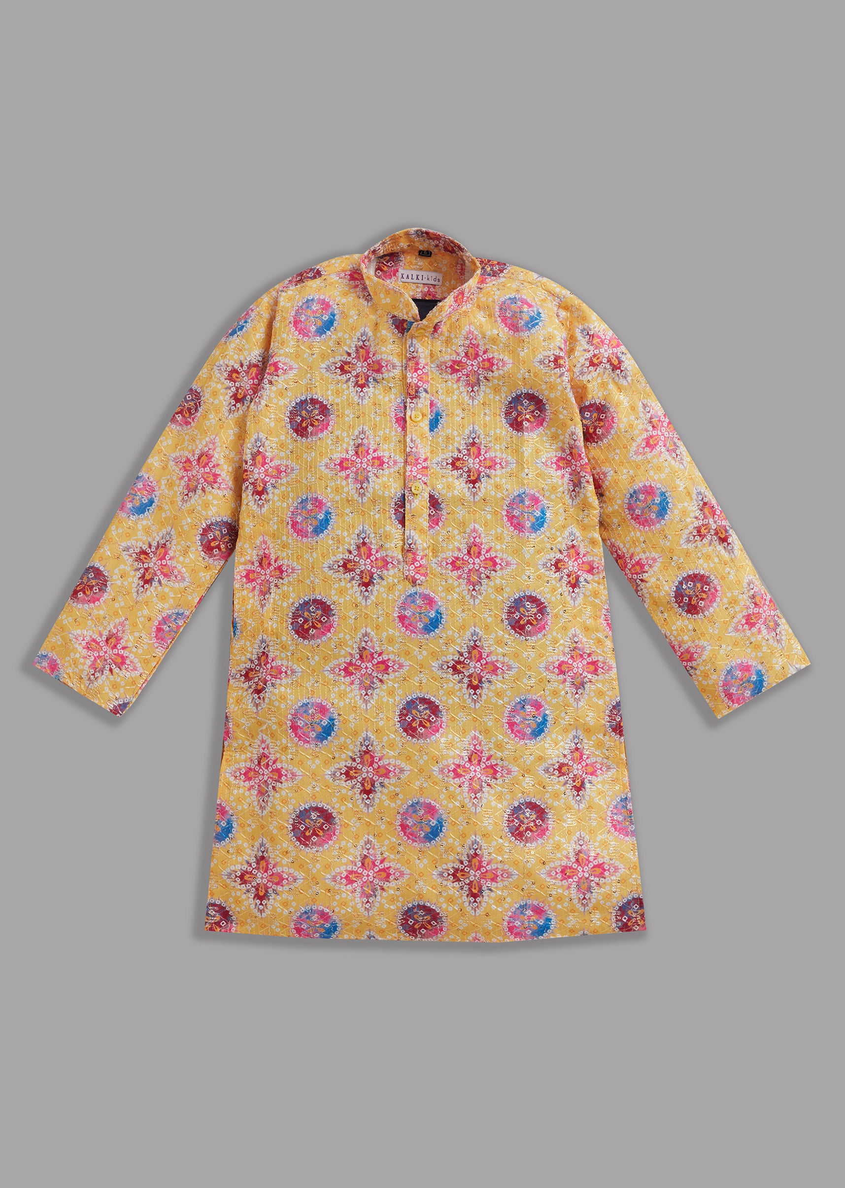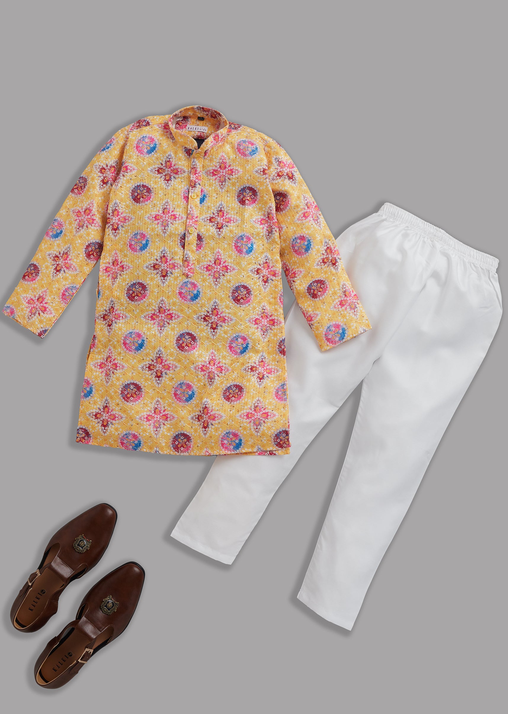 This kurta set features a bright yellow base adorned with colorful traditional motifs, paired with classic white pajama bottoms for a crisp and balanced look. Crafted from lightweight, breathable fabric, the kurta offers all-day comfort while its eye-catching pattern adds a cheerful, festive charm. Ideal for cultural events, family gatherings, or casual celebrations, this outfit blends tradition with playful color. Awarded as the Most Trusted Brand, we're delivering styles you love, just as promised.