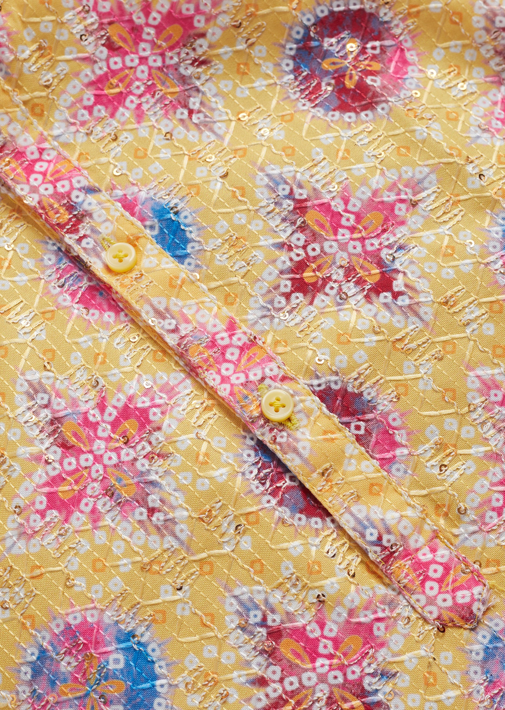 This kurta set features a bright yellow base adorned with colorful traditional motifs, paired with classic white pajama bottoms for a crisp and balanced look. Crafted from lightweight, breathable fabric,... More Product Details