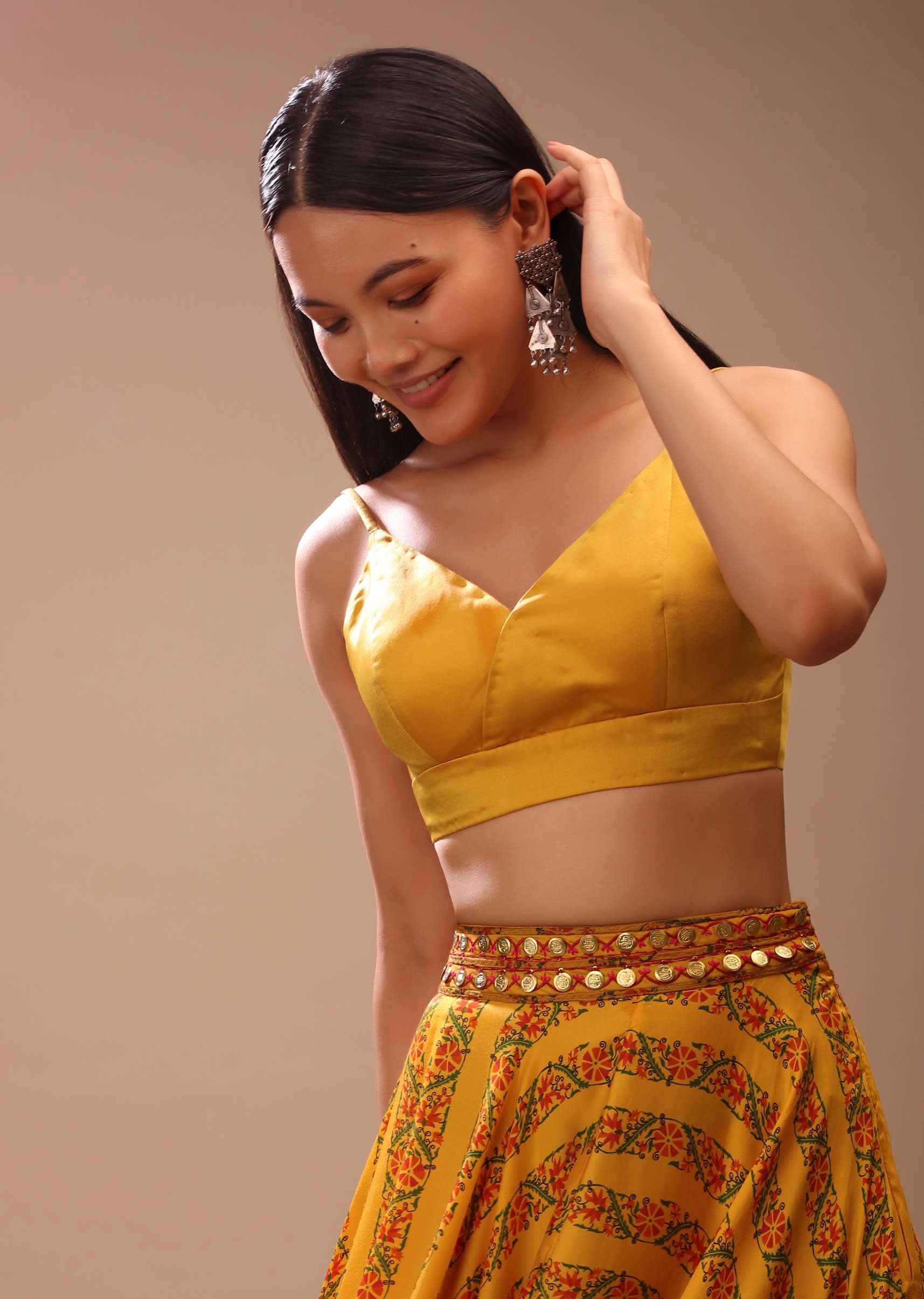 Amber Yellow Blouse In Satin With Strap Sleeves And Overlapping Geometric Neckline