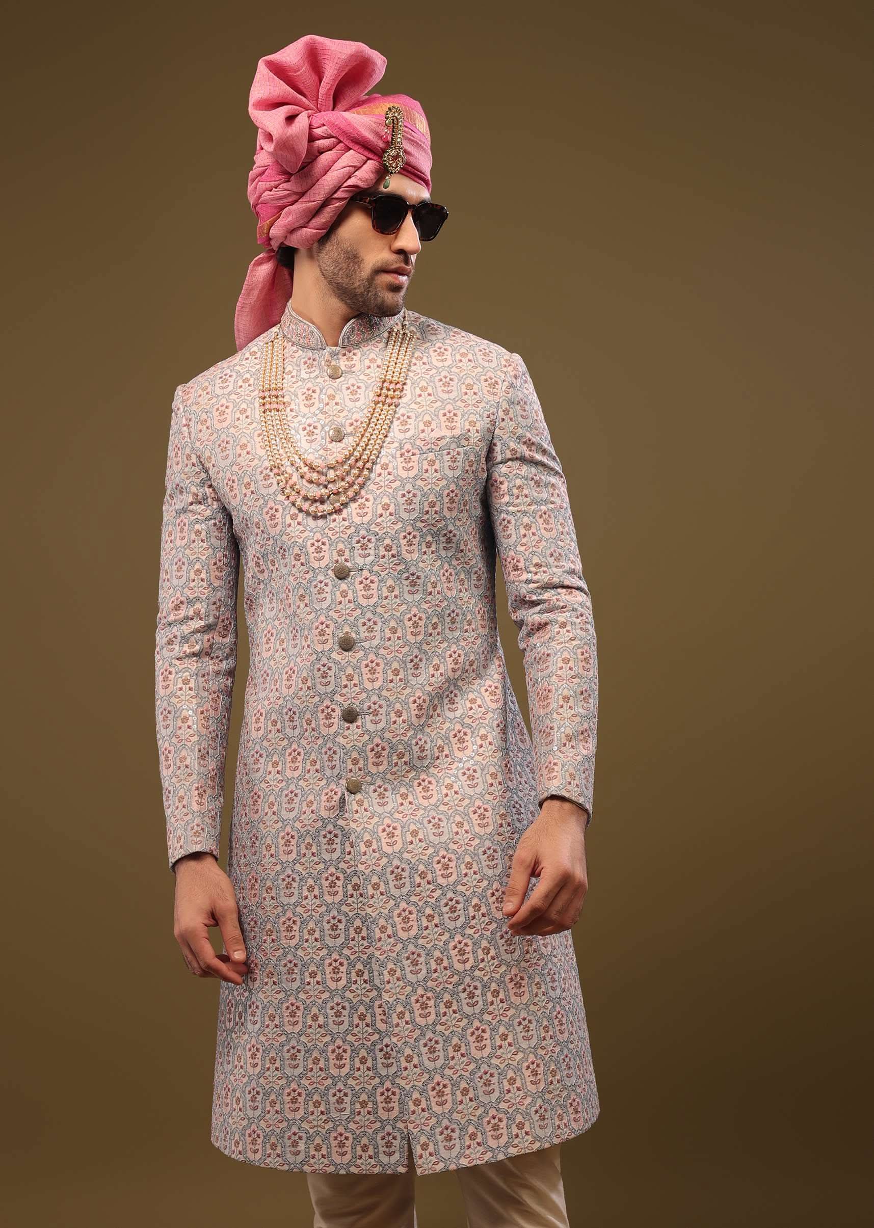 - A classic angel fall blue sherwani set fabricated in silk, and is crafted with hand-embroidered sequins and thread weave in a beautiful design.