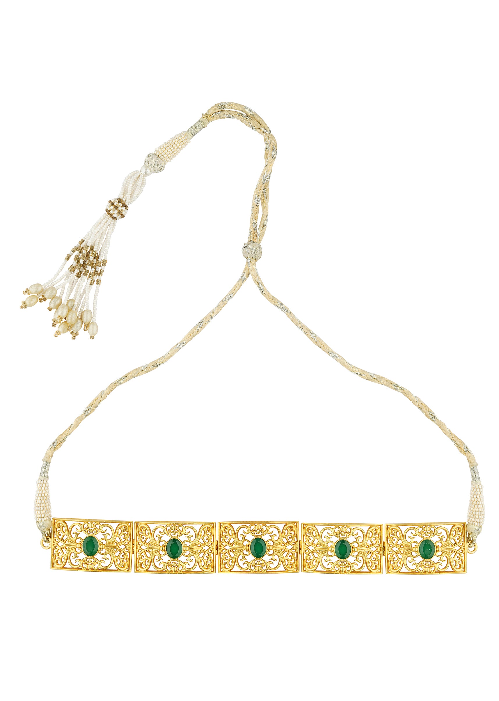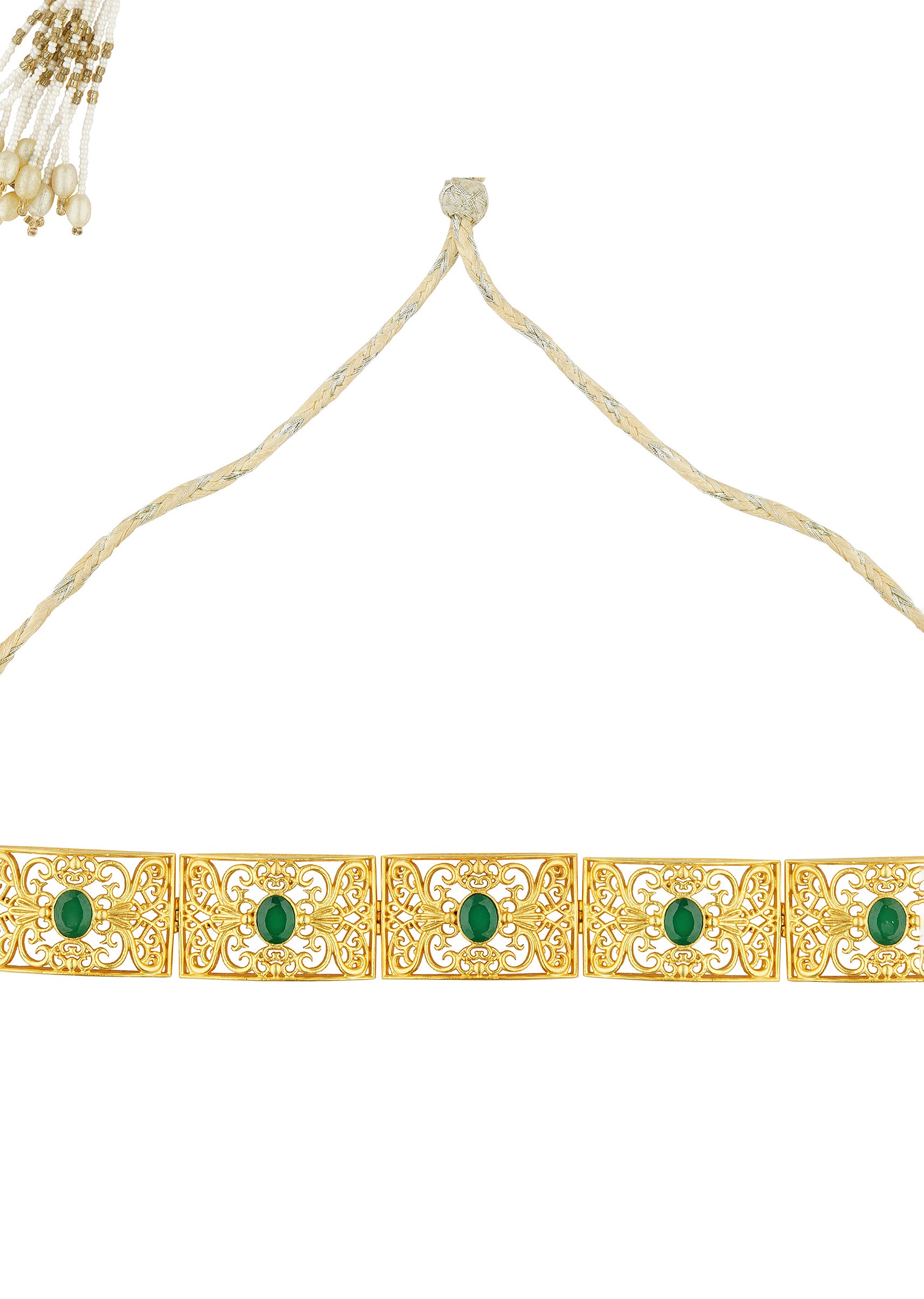 This Antique Gold Choker Necklace Showcases A Symmetrical Design Crafted In Mix Metal Adorned With Green Zircon Stones. Its Intricate Lattice Pattern And Bold Structure Make It Suitable For Traditional... More Product Details