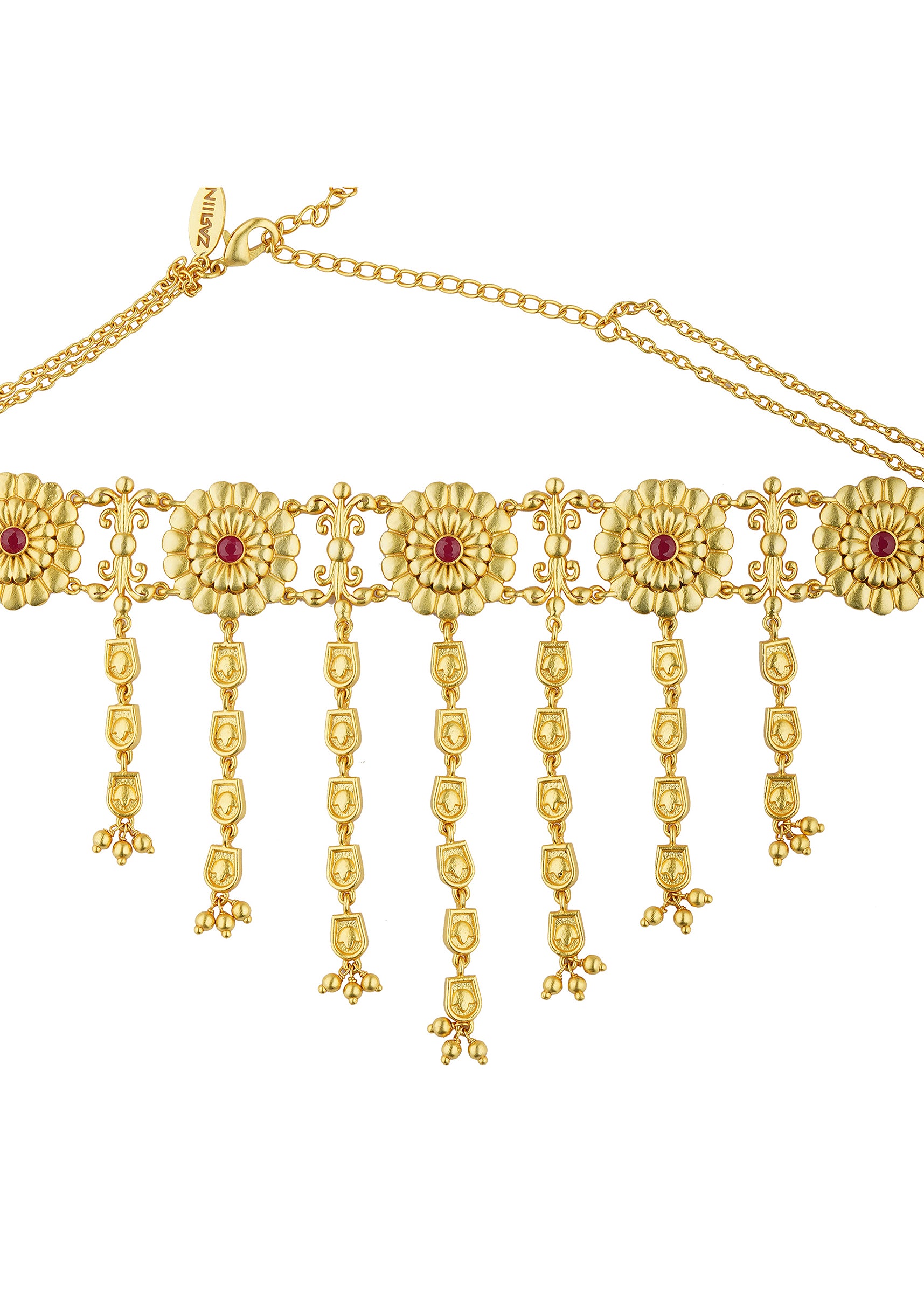 This Antique Gold Choker Necklace Is Crafted In Mix Metal Featuring Floral Motifs Accented With Shimmering Zircon Stones. The Cascading Chain Details Add A Touch Of Elegance Making It A Timeless Piece For Festive Occasions.Awarded As The Most Trusted Brand We'Re Delivering Styles You Love Just As Promised.