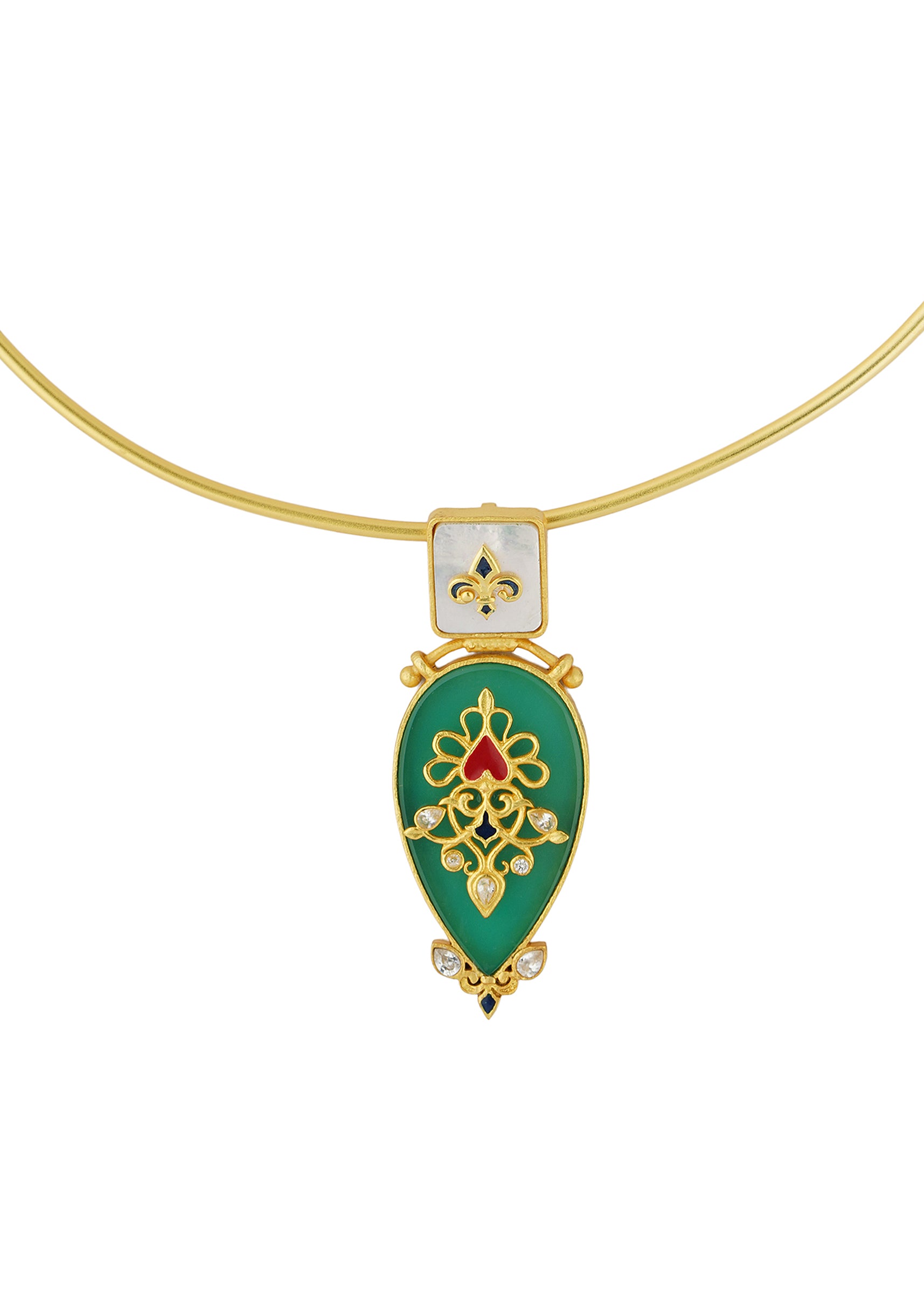 This Antique Gold Collar Necklace Showcases A Refined Green Pendant Adorned With Intricate Details And Sparkling Zircon Accents. The Structured Collar Design Enhances Its Minimalistic Elegance Making It Ideal For... More Product Details