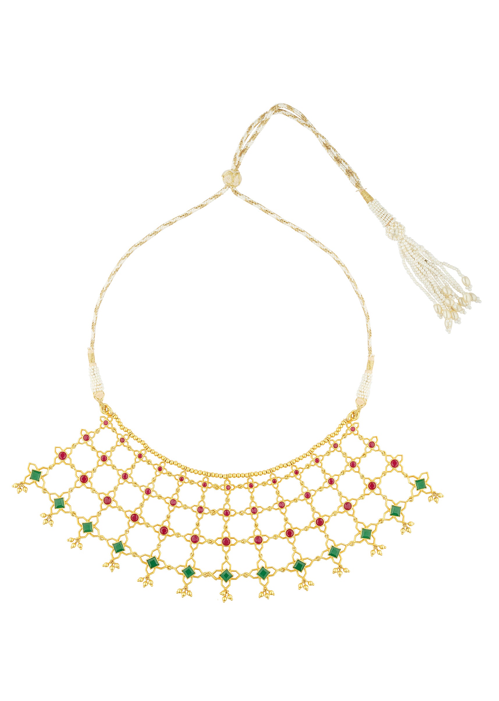 This Antique Gold Necklace Is Crafted From Mix Metal And Features A Lattice Design Adorned With Green And Pink Zircon Accents. The Intricate Craftsmanship Combines Elegance With Timeless Appeal Making... More Product Details