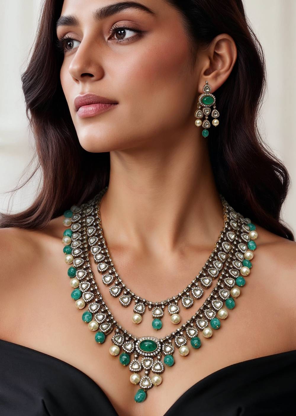 An aqua blue layered modern polki pendant necklace set featuring sparkling polki stones and elegant layered detailing, blending fresh contemporary design with traditional grace. Perfect for adding a vibrant and... More Product Details