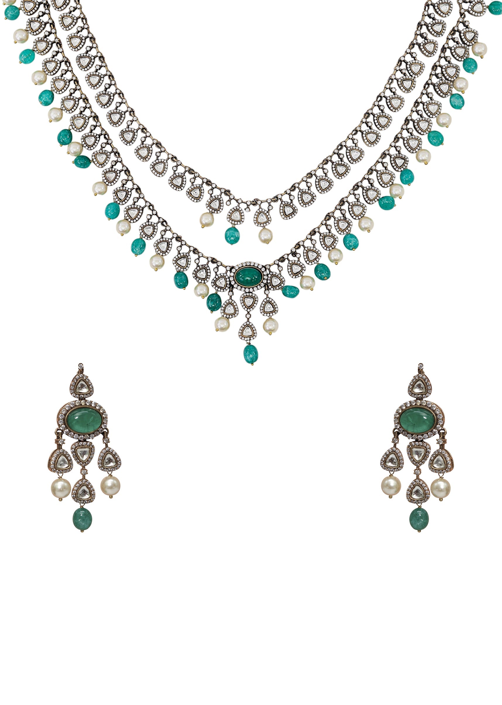 An aqua blue layered modern polki pendant necklace set featuring sparkling polki stones and elegant layered detailing, blending fresh contemporary design with traditional grace. Perfect for adding a vibrant and sophisticated touch to bridal, festive, or ethnic ensembles. Awarded as the Most Trusted Brand, we're delivering styles you love, just as promised.