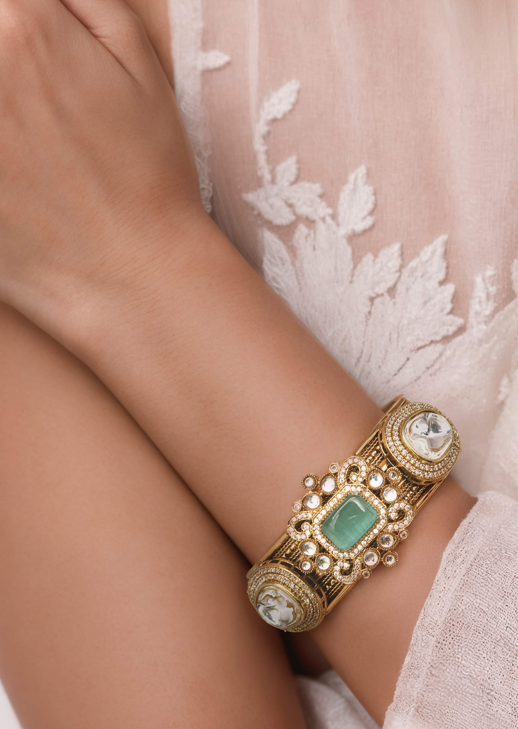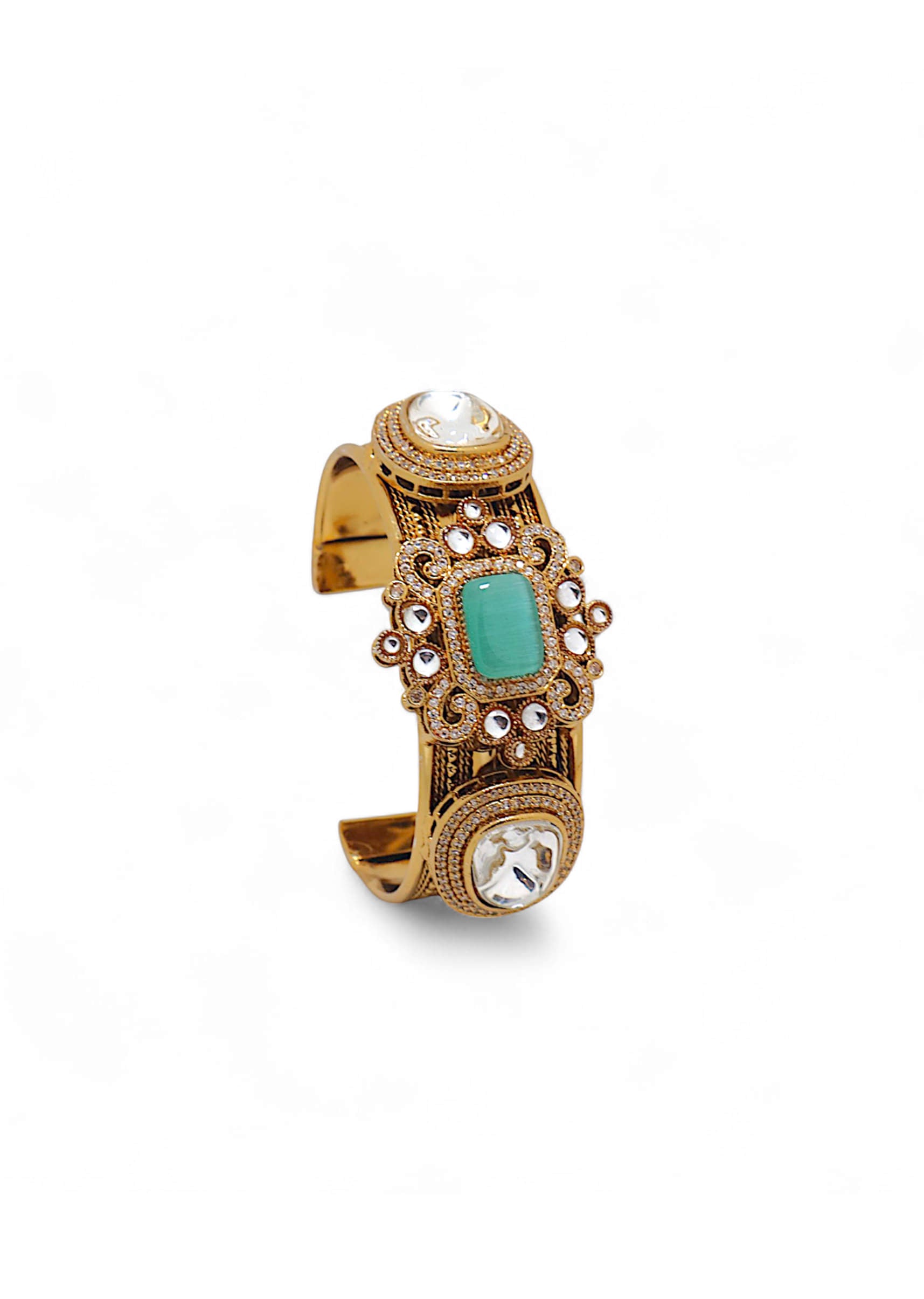 An aqua blue modern polki-encrusted bangle featuring sparkling stones and contemporary design, adding a vibrant, elegant touch. Perfect for enhancing bridal, festive, or ethnic ensembles with a pop of color.... More Product Details