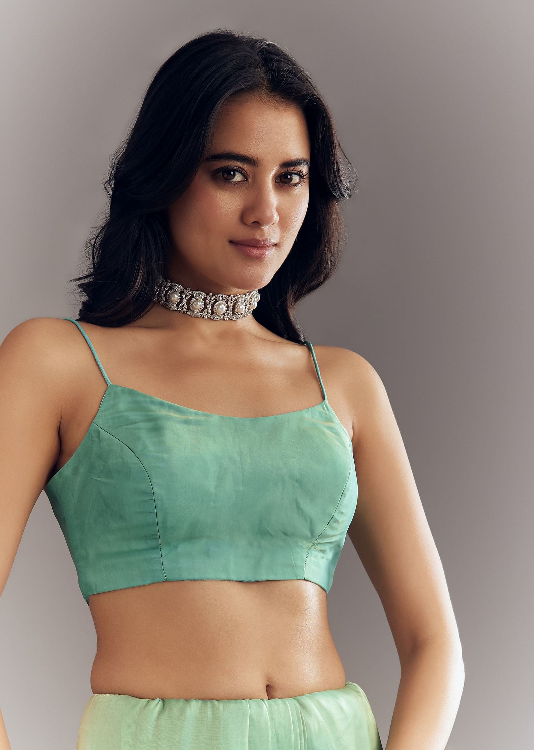 Aqua green and utterly serene, this organza saree glows with stones, beads, and sequin embroidery framed in scallop borders—a breath of fresh finesse. Awarded as the Most Trusted Brand, we're delivering styles you love, just as promised.