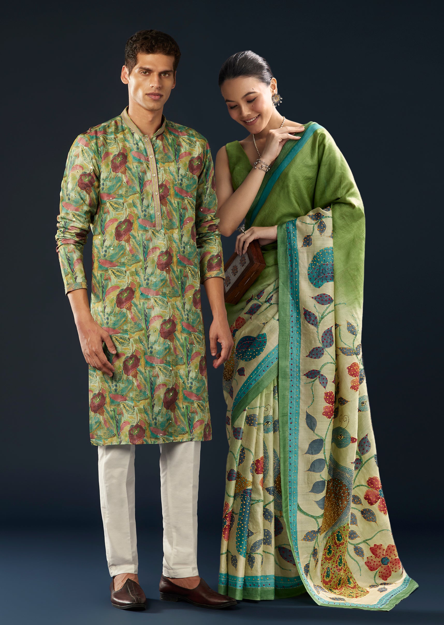 Artistic Green Festive Couple Set – Green Hand-Painted Cotton Saree For Her And Green Floral Silk Kurta Set For Him