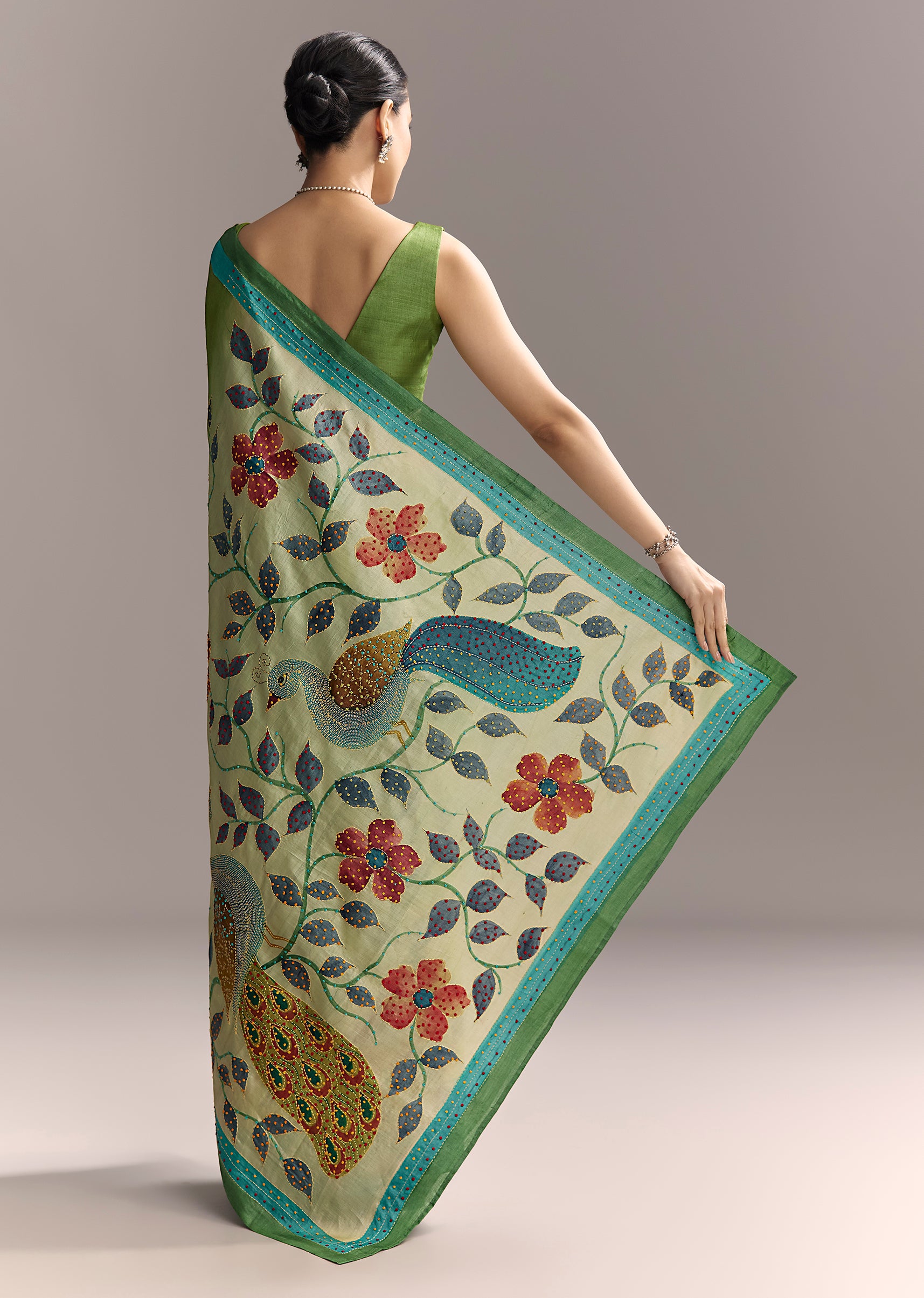 Unique and expressive, this green cotton saree with hand-painted motifs adds an artistic edge to festive wear.