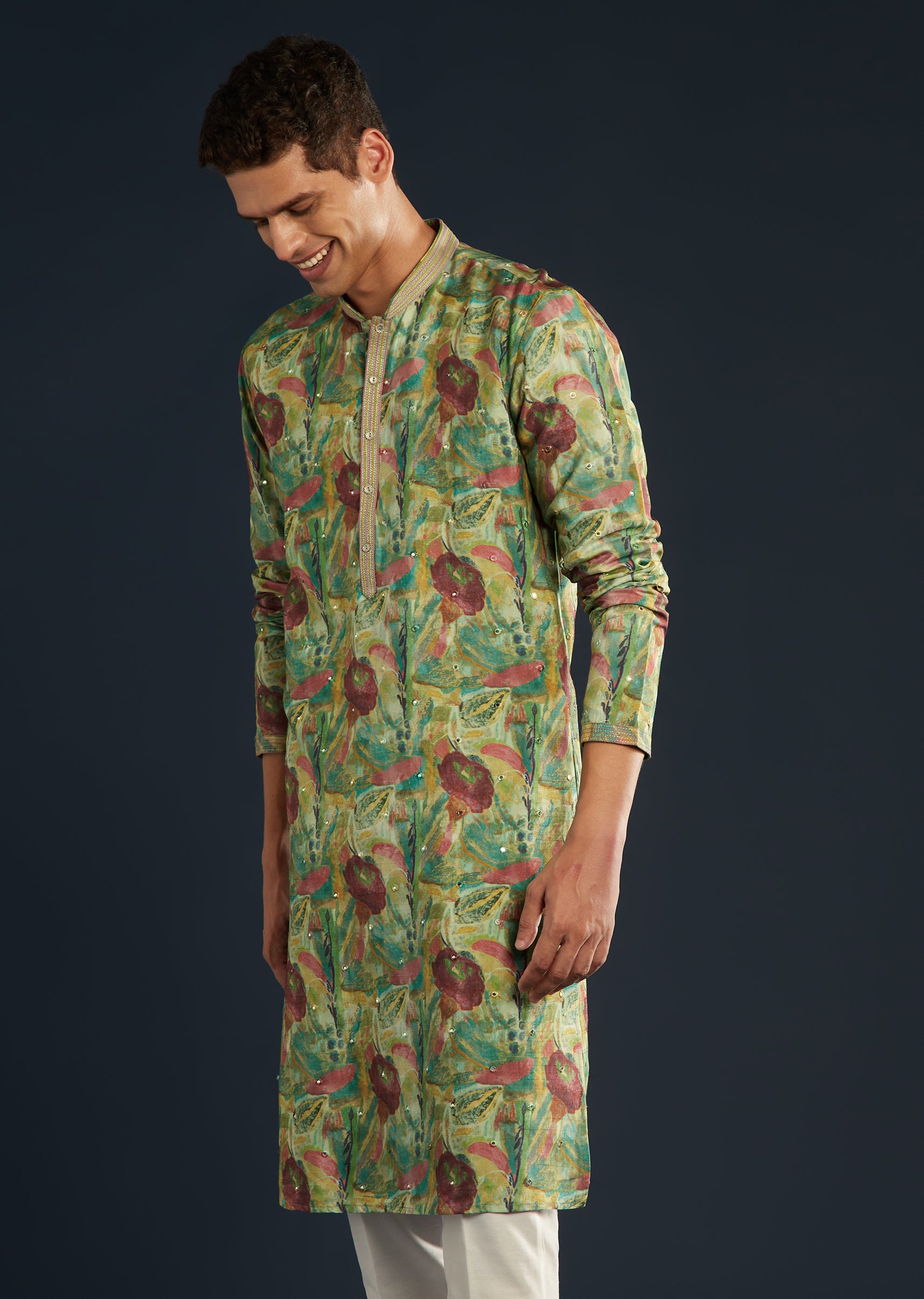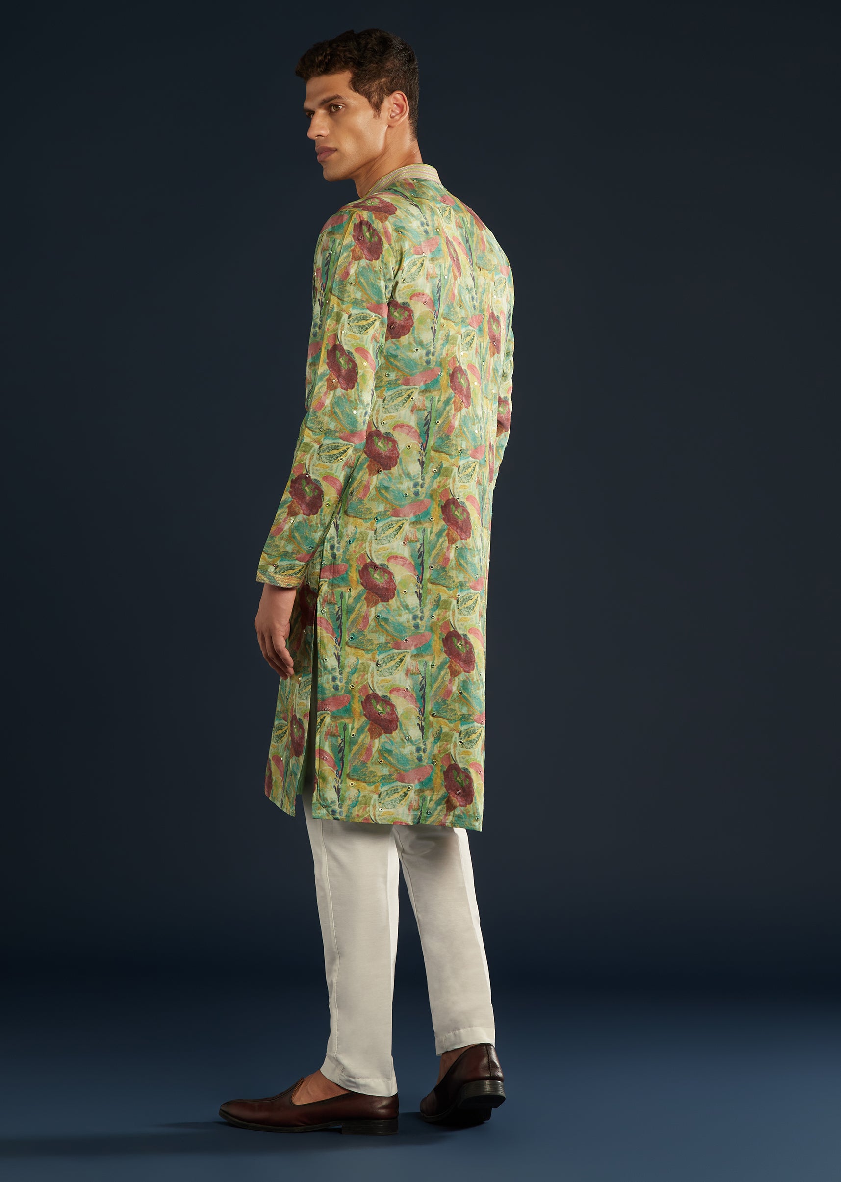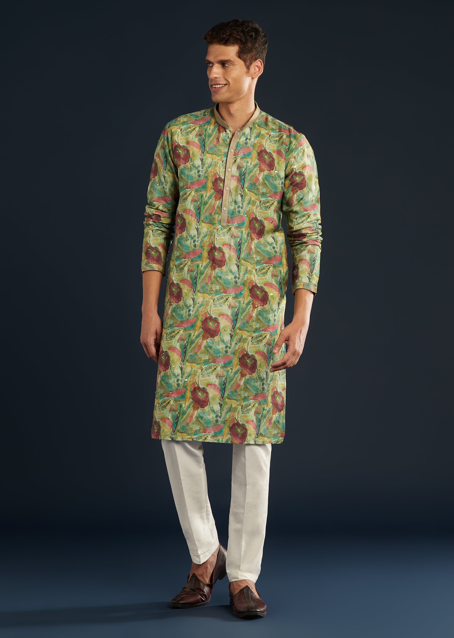 Refined and coordinated, this green floral print silk kurta set enhances the handcrafted aesthetic.