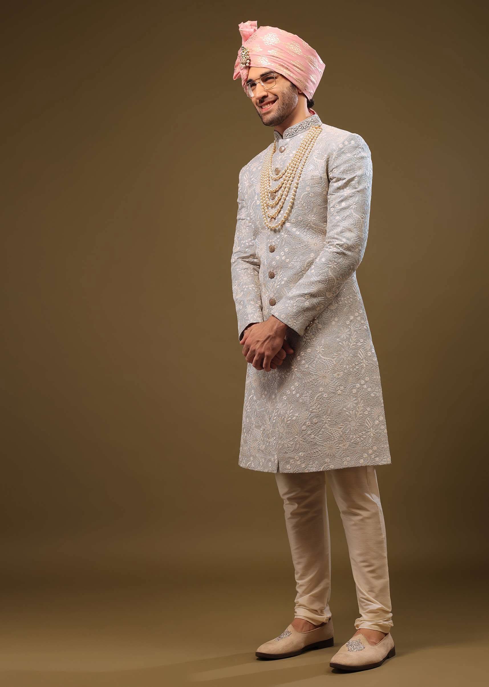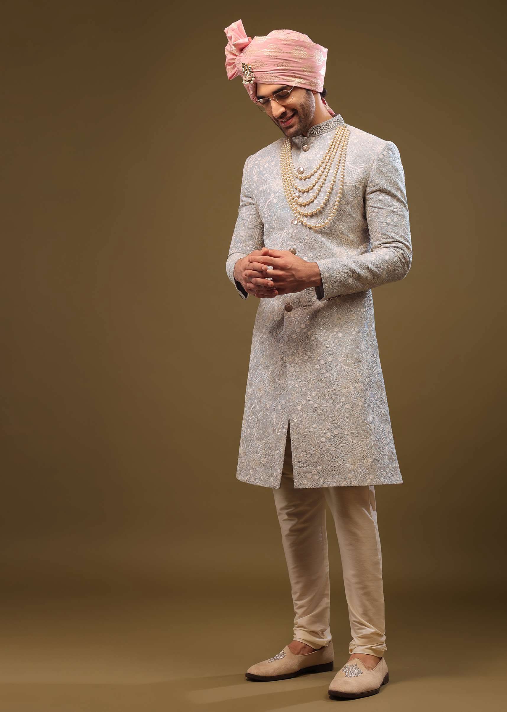 - A gorgeous baby blue sherwani set fabricated in silk, crafted in a hand-embroidered zari and sequins work in a beautiful floral design.