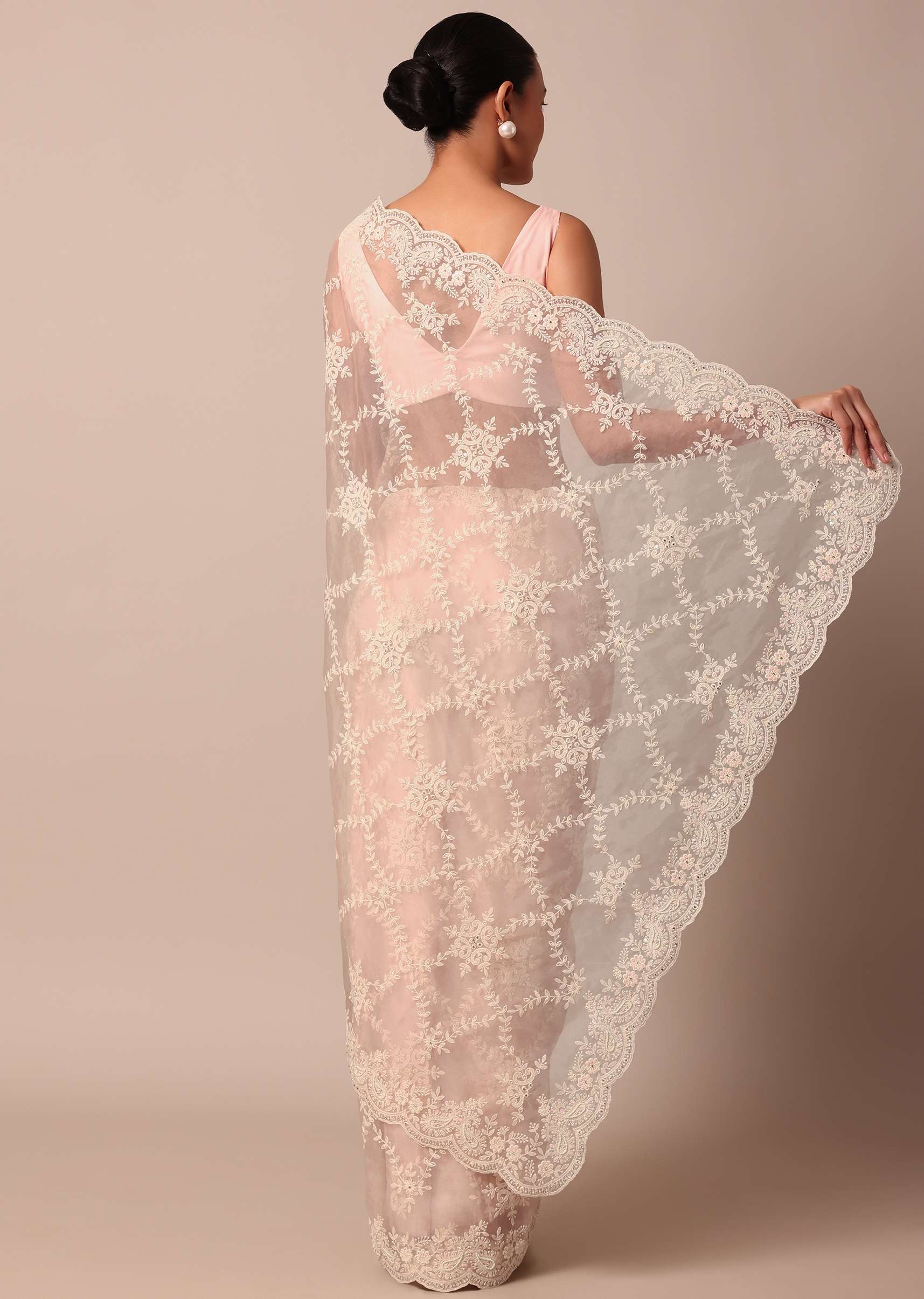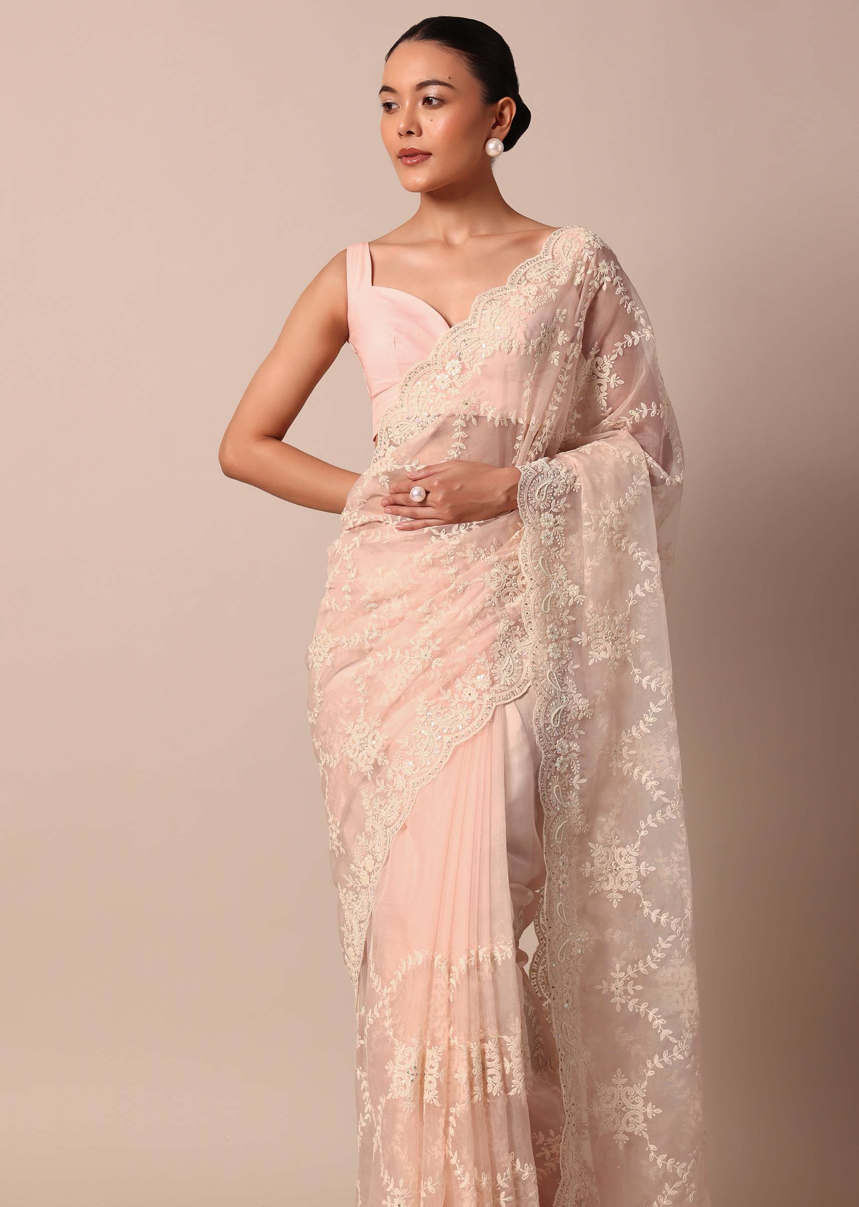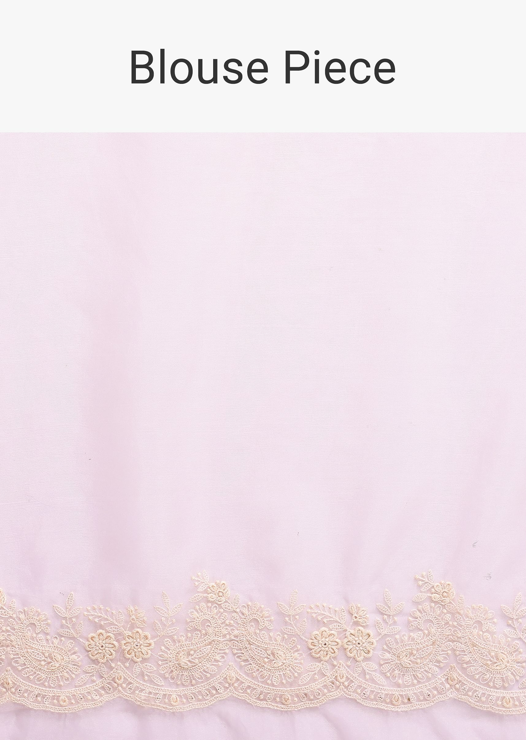 Baby Pink Chikankari Organza Silk Saree With Scallop Border And Unstitched Blouse Fabric