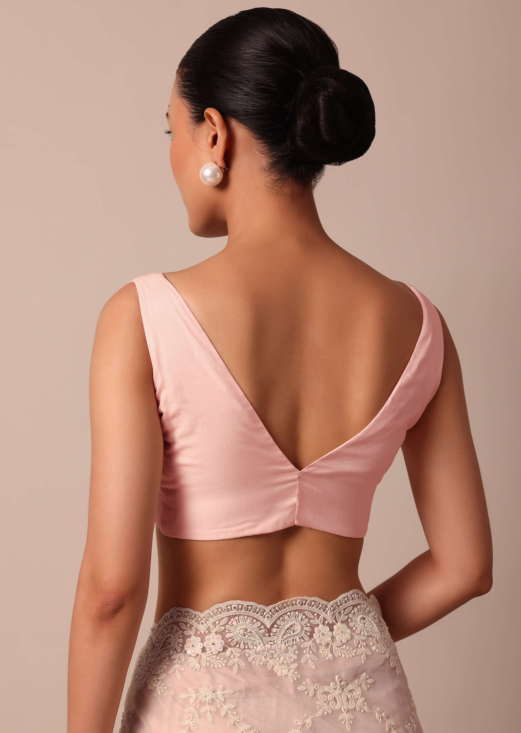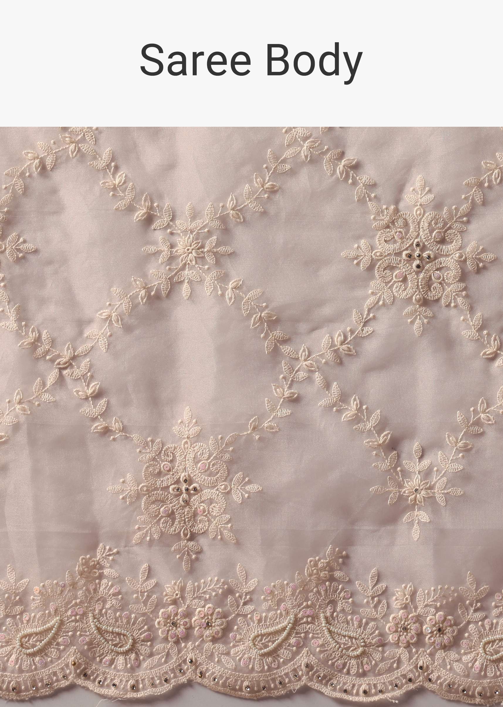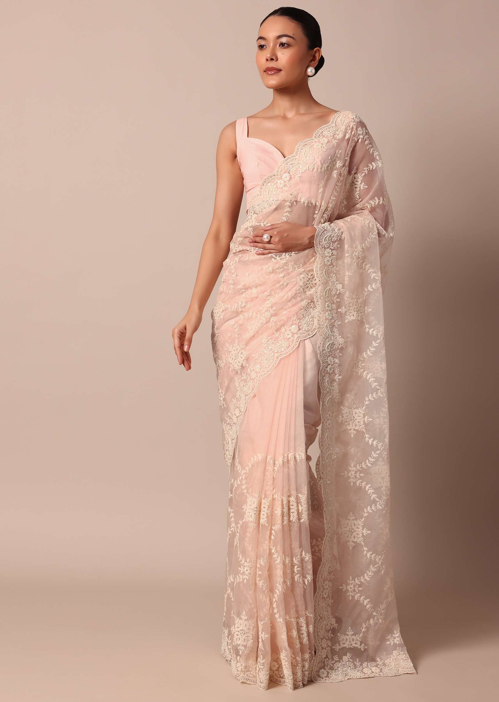 Baby Pink Chikankari Organza Silk Saree With Scallop Border And Unstitched Blouse Fabric