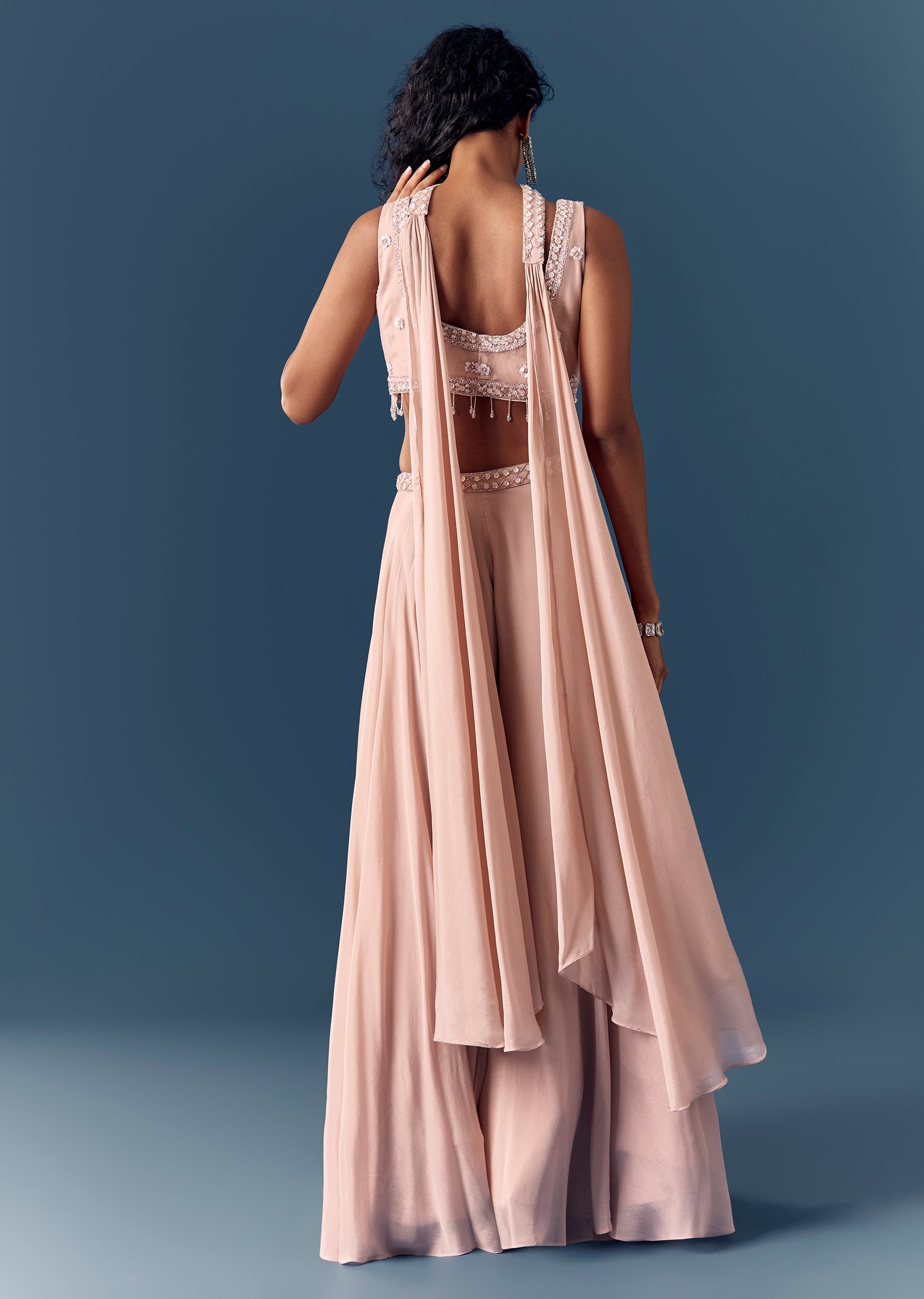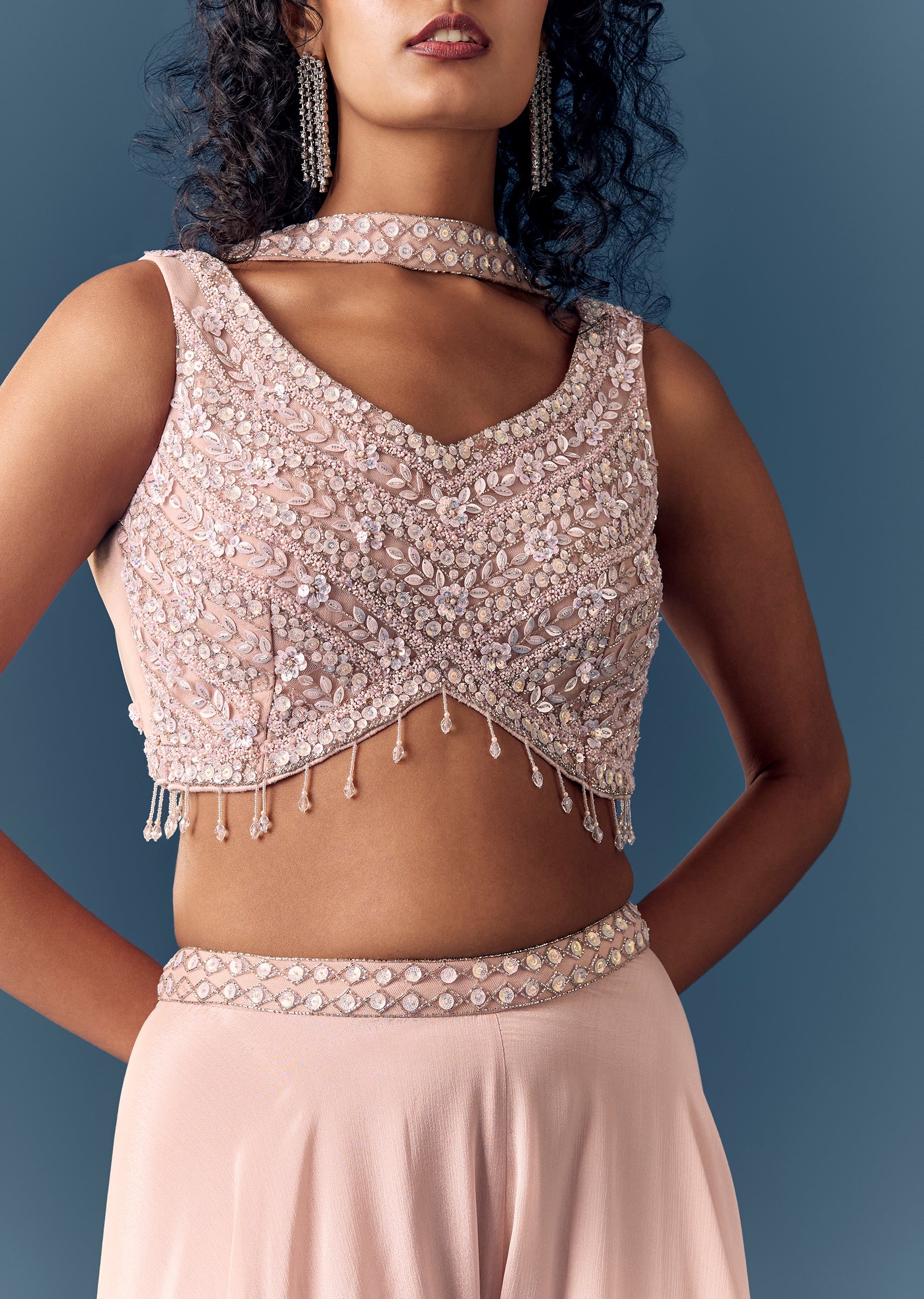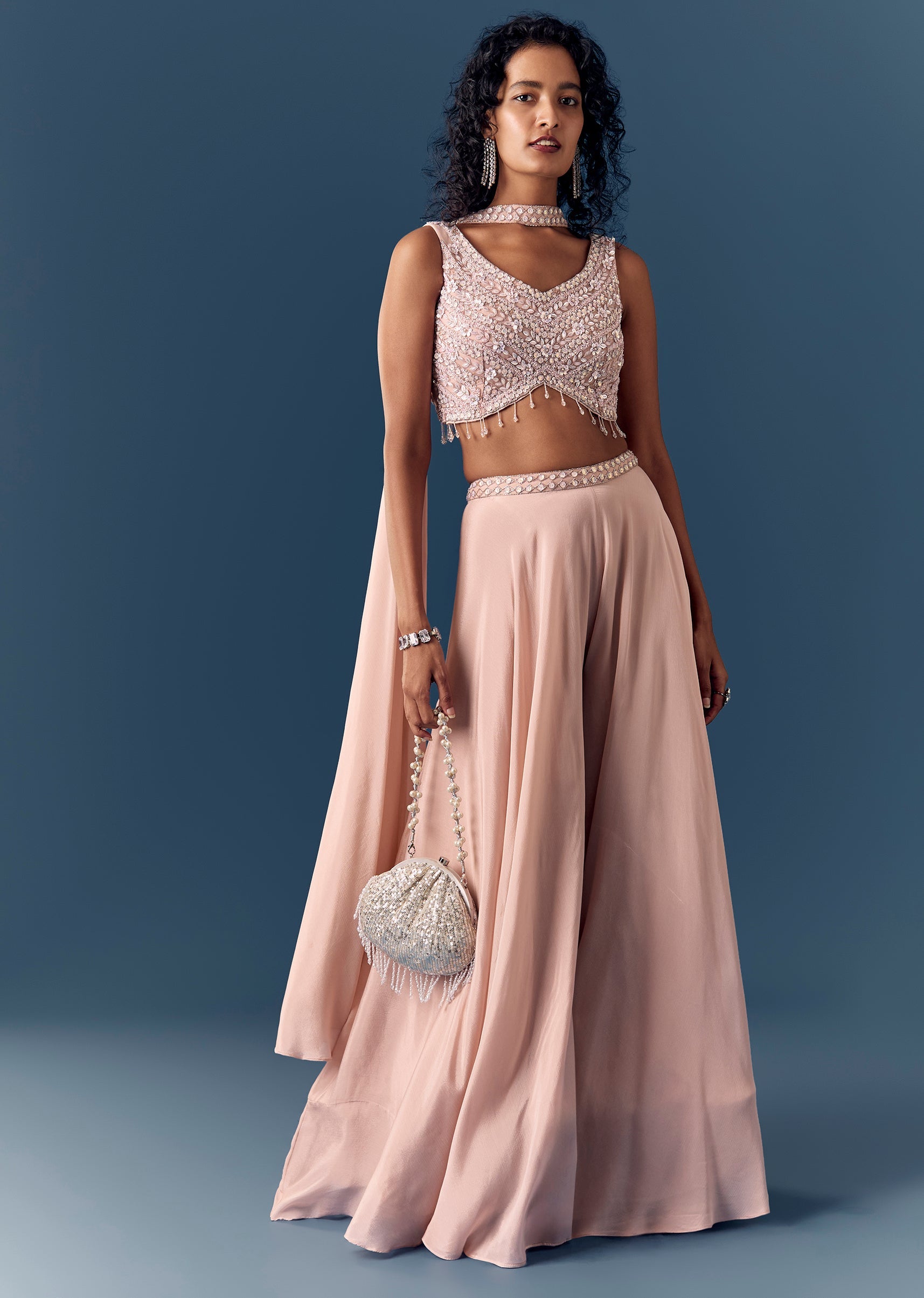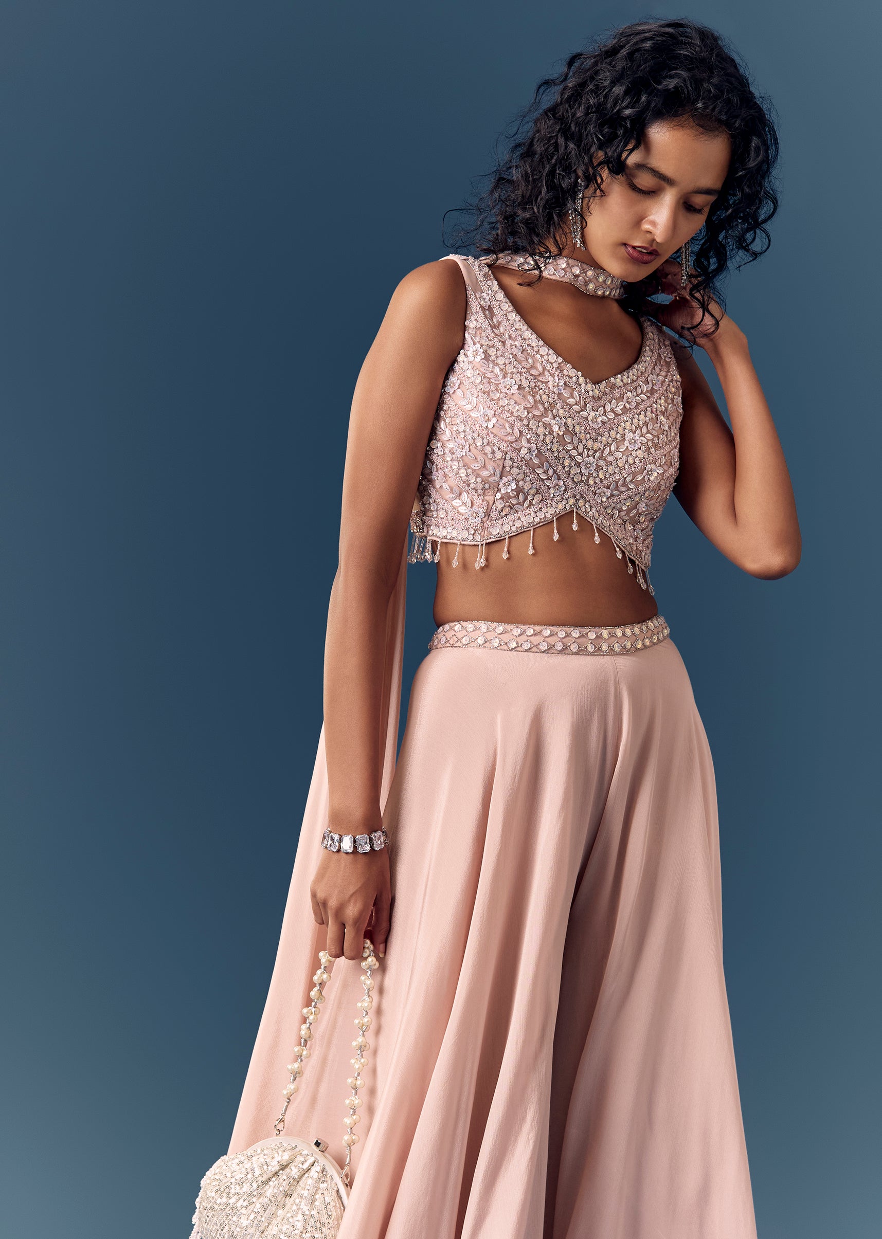 Baby Pink Embellished Croptop Palazzo Set With Dupatta