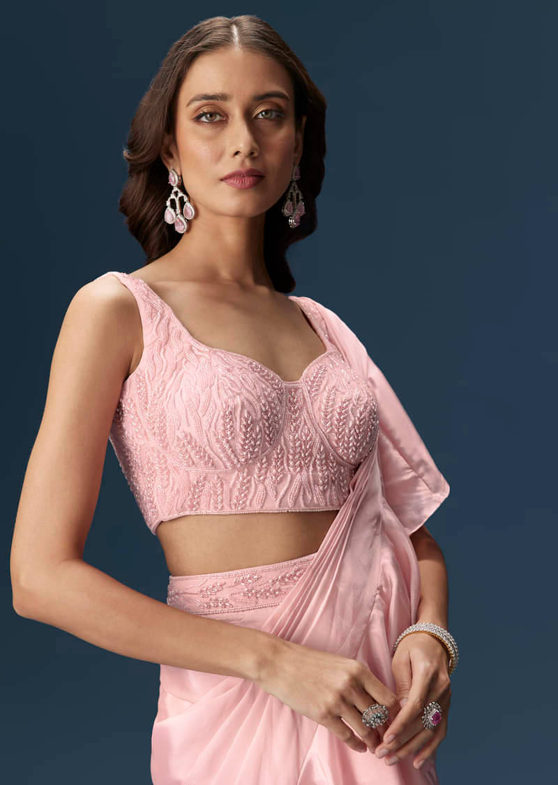 A romantic baby pink frill saree paired with a sleeveless blouse featuring a fancy neckline. Crafted in soft crepe and net, embellished with moti for a delicate shimmer. Perfect for... More Product Details