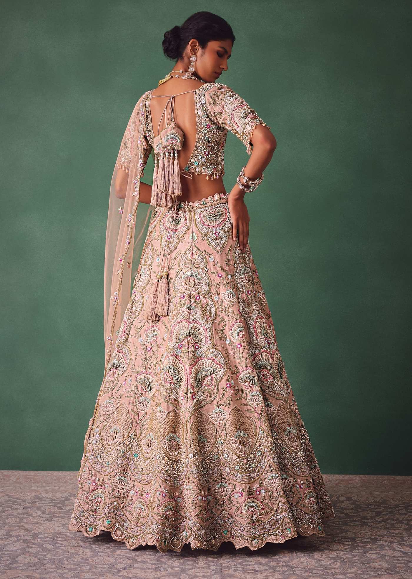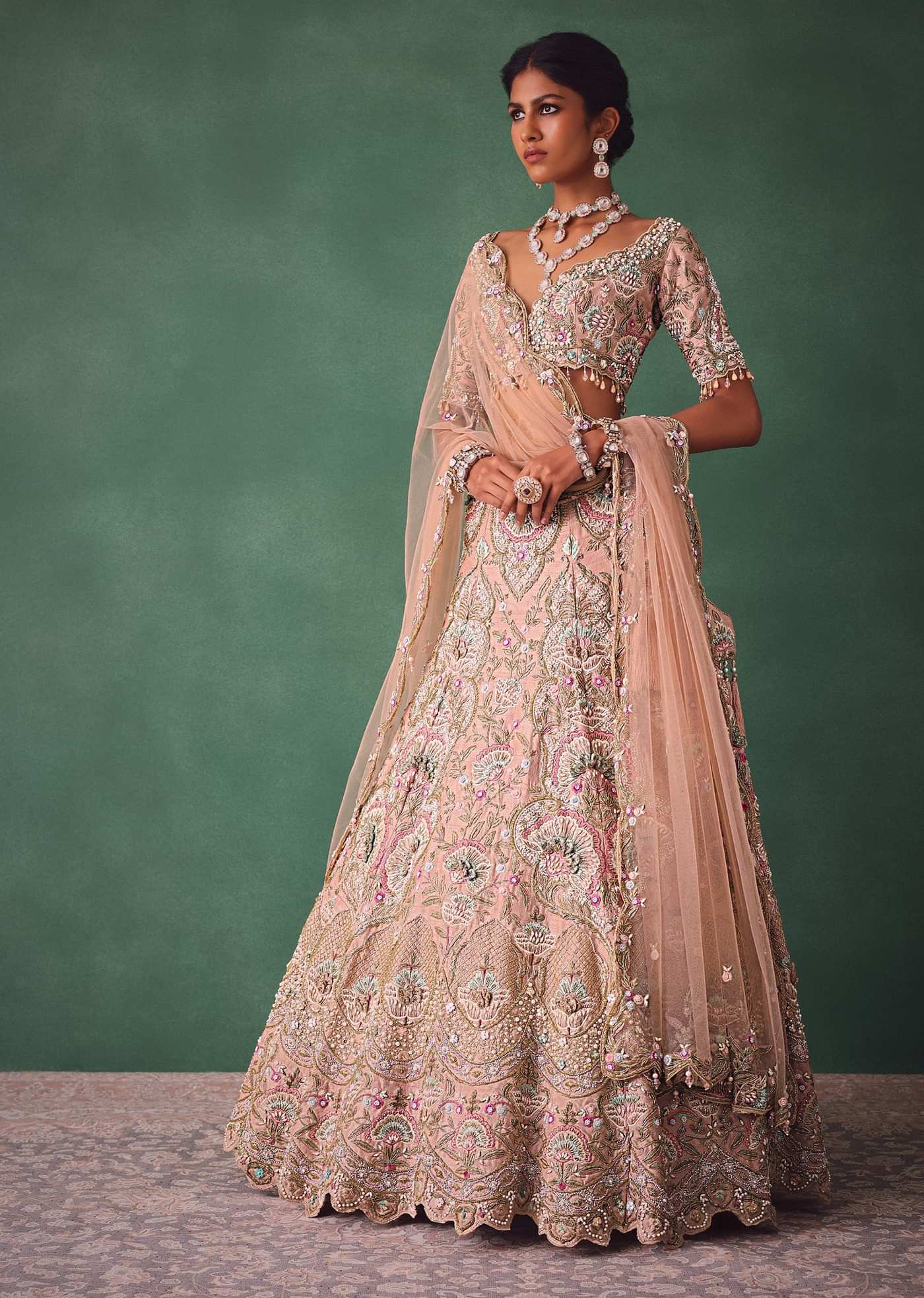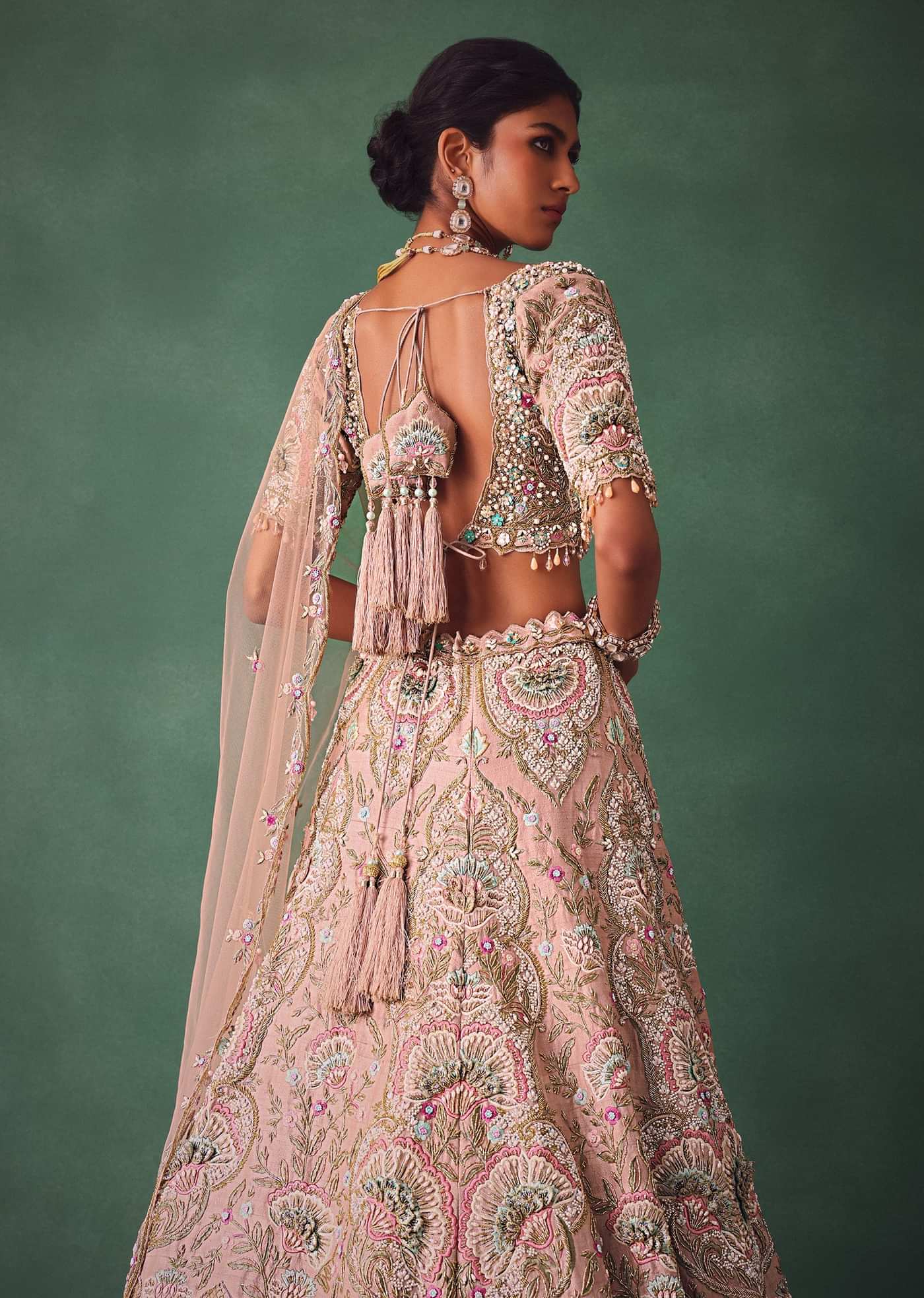 Baby Pink Jaal Work Lehenga With Sweetheart Neck Blouse And Embroidered Dupatta
