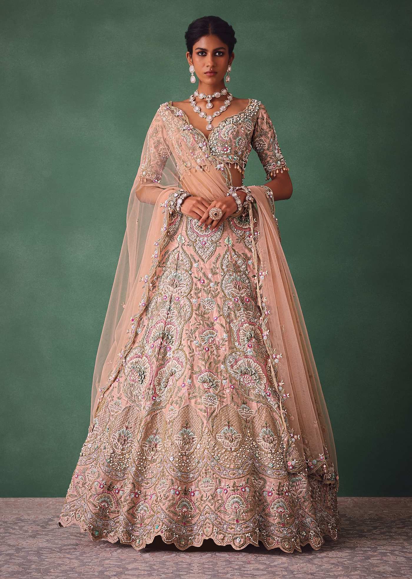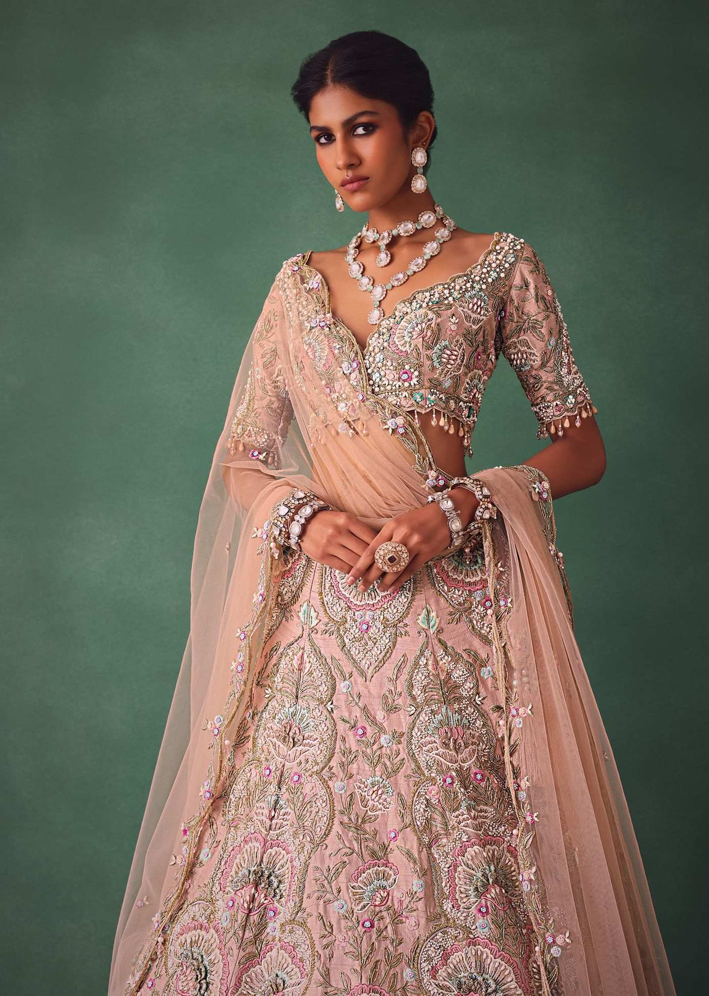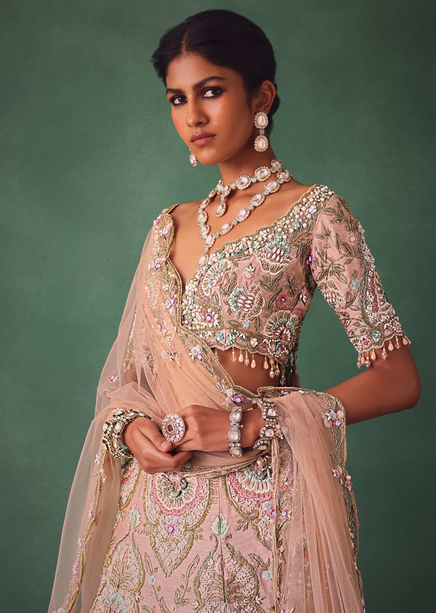 Baby Pink Jaal Work Lehenga With Sweetheart Neck Blouse And Embroidered Dupatta
