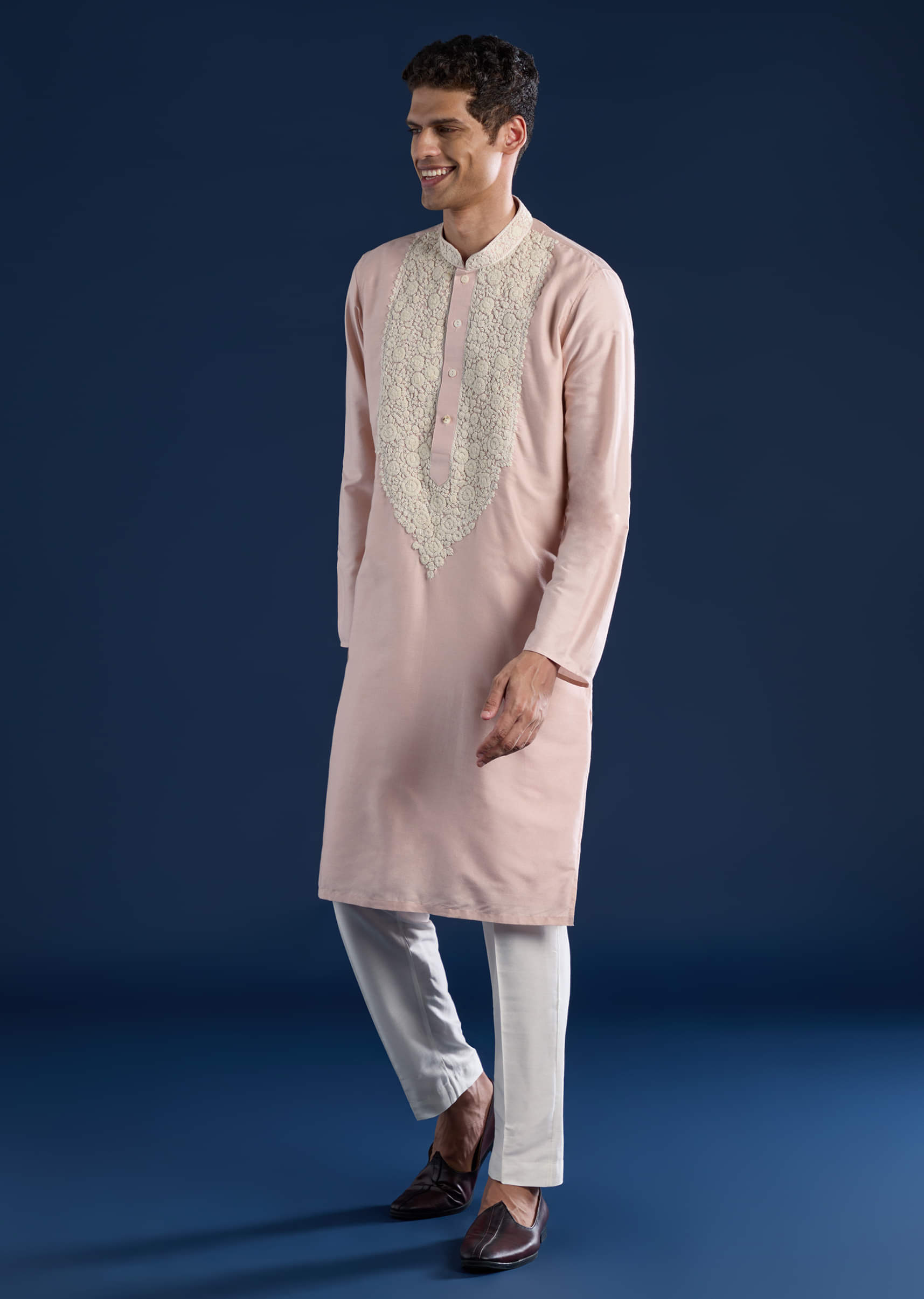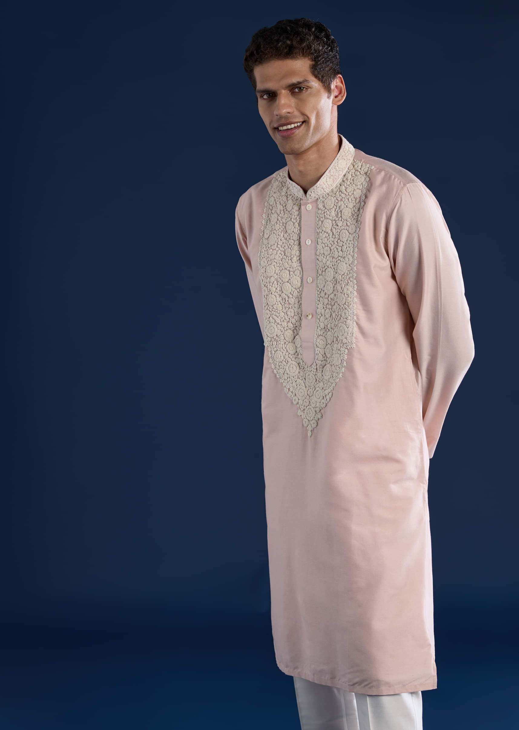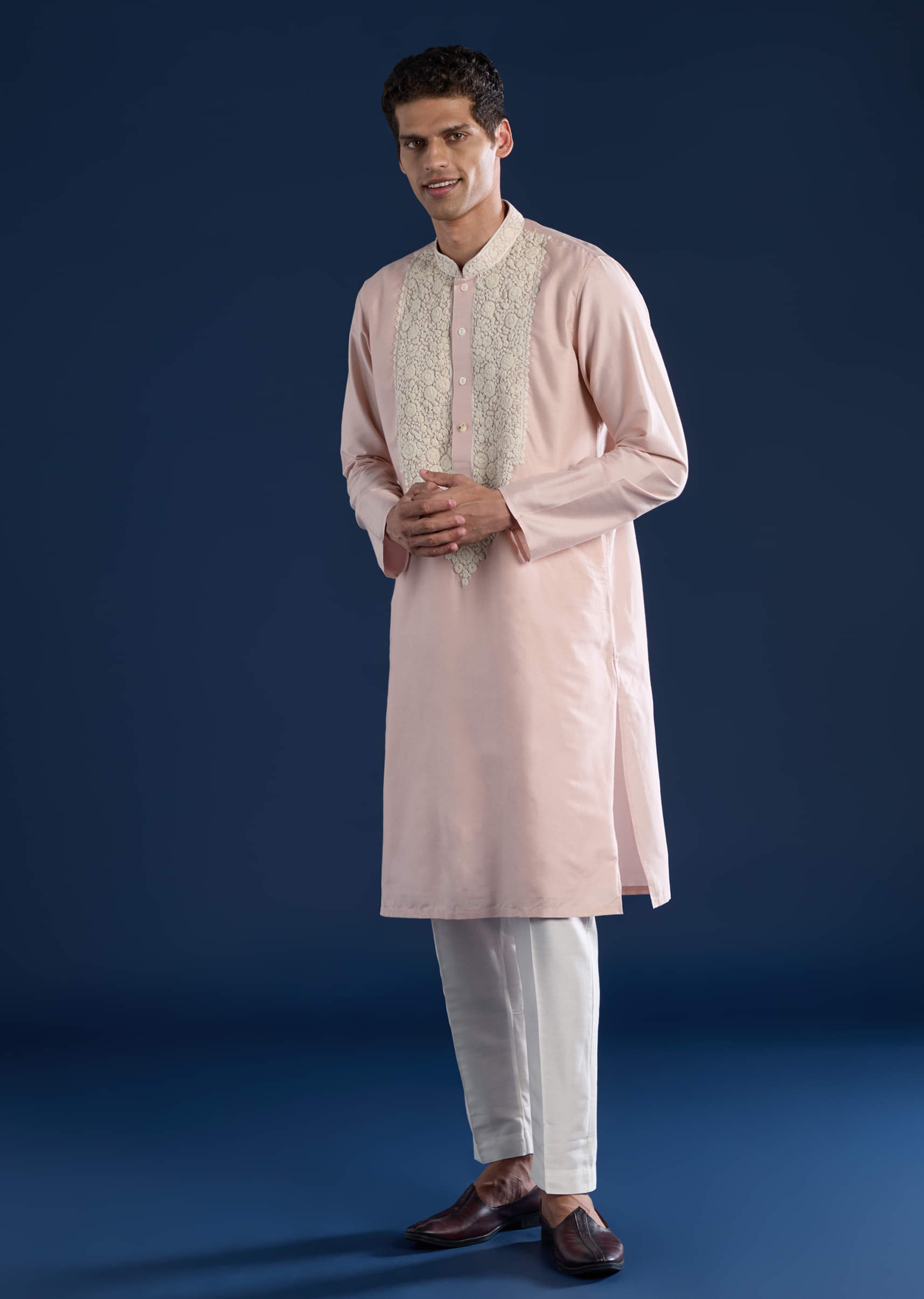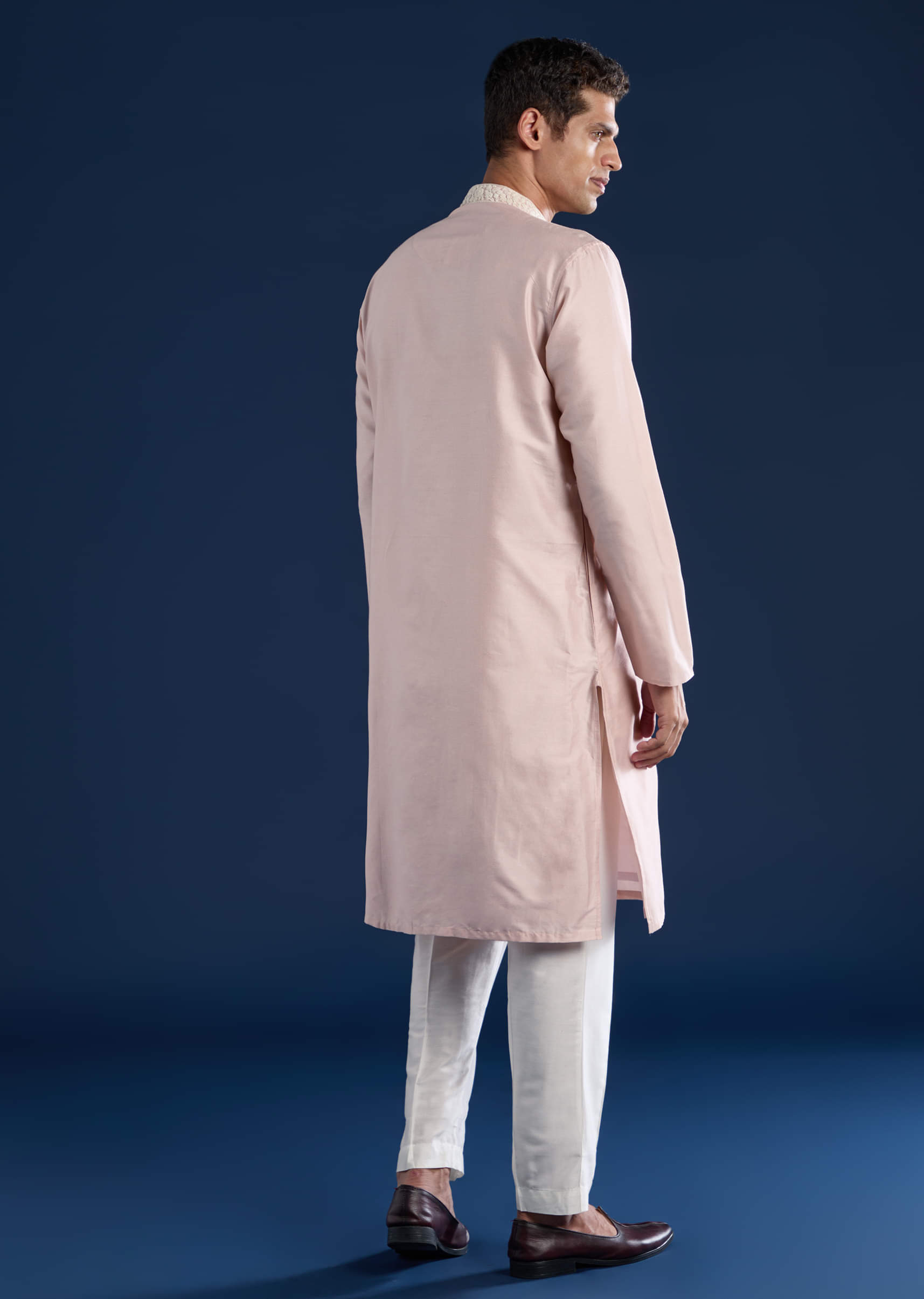 Baby Pink Kashmiri Work Banarsi Silk Mens Kurta and Pant Set