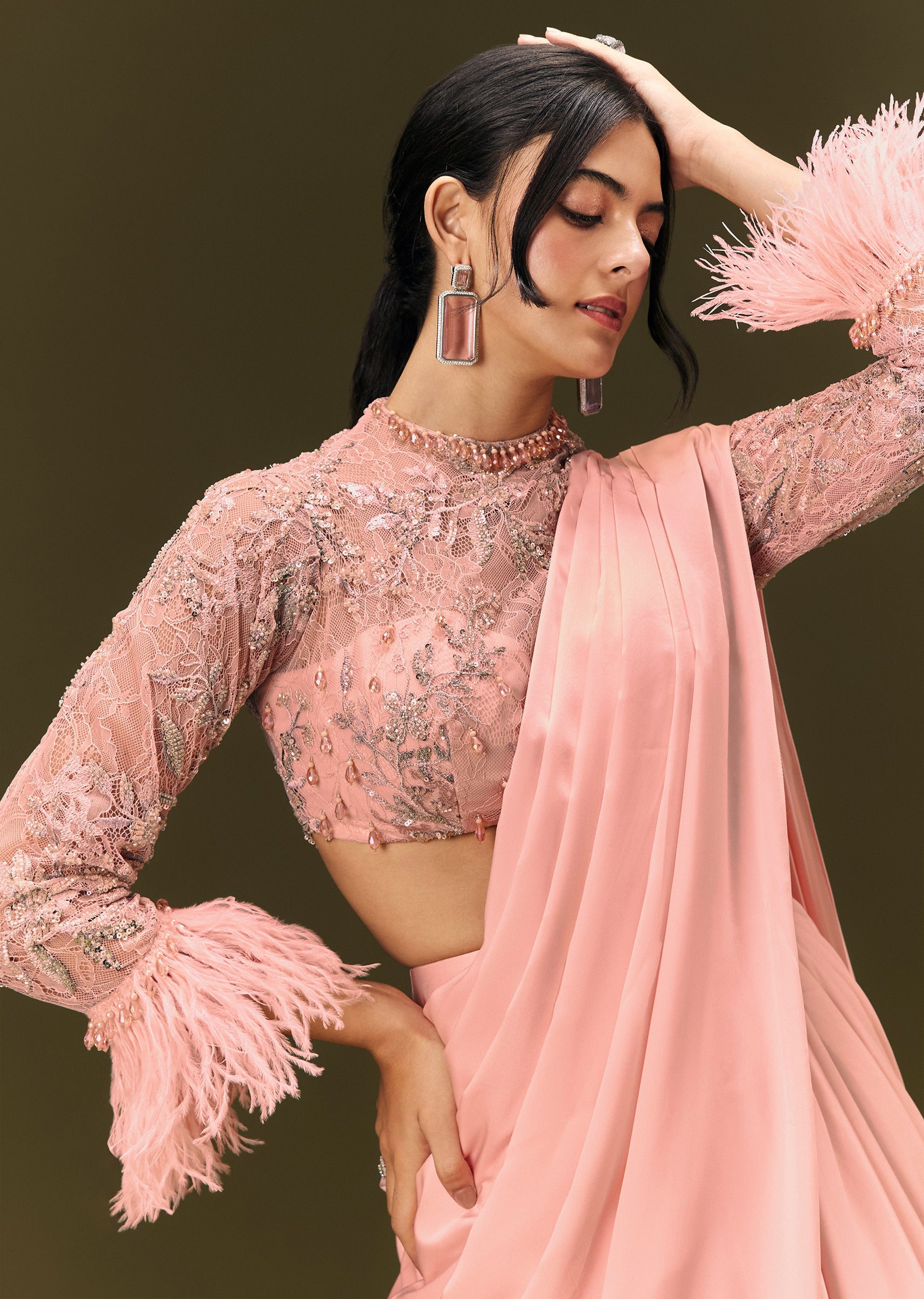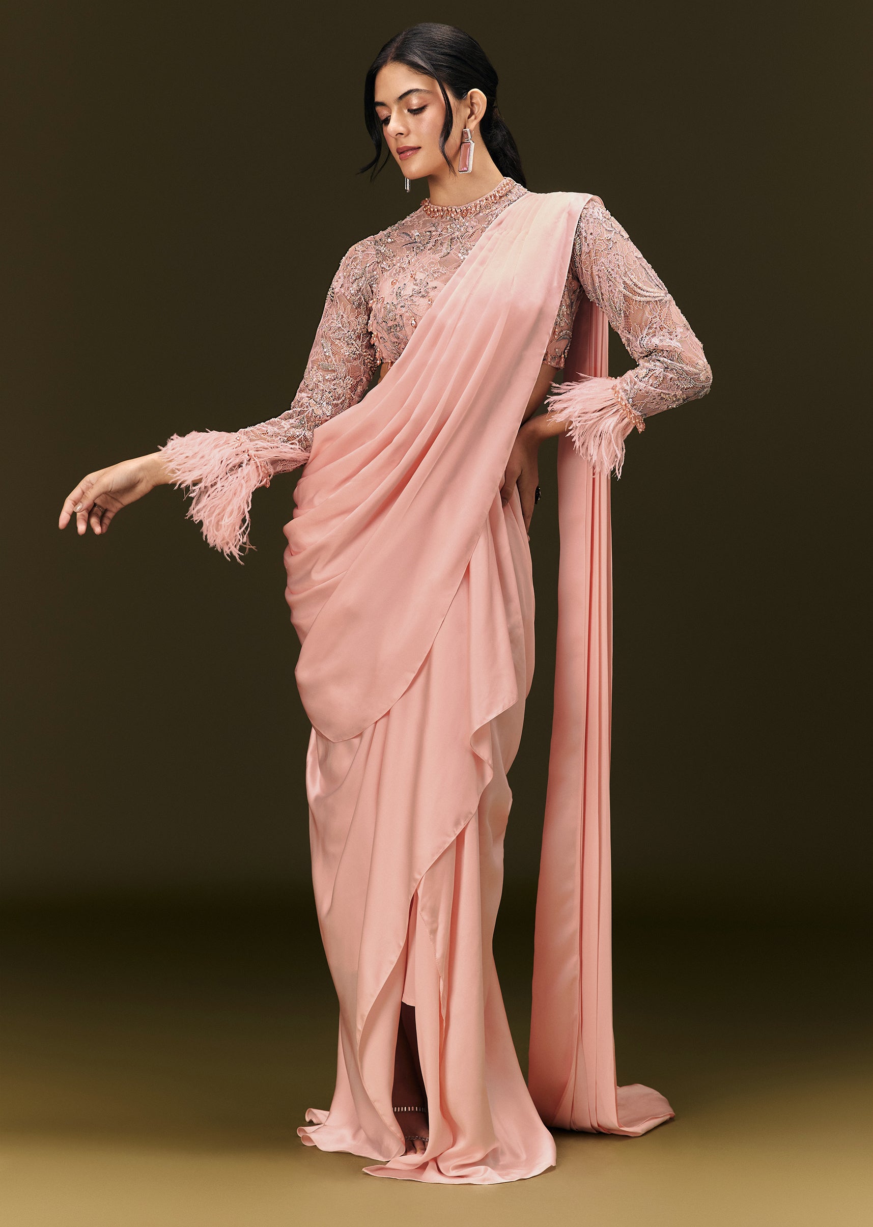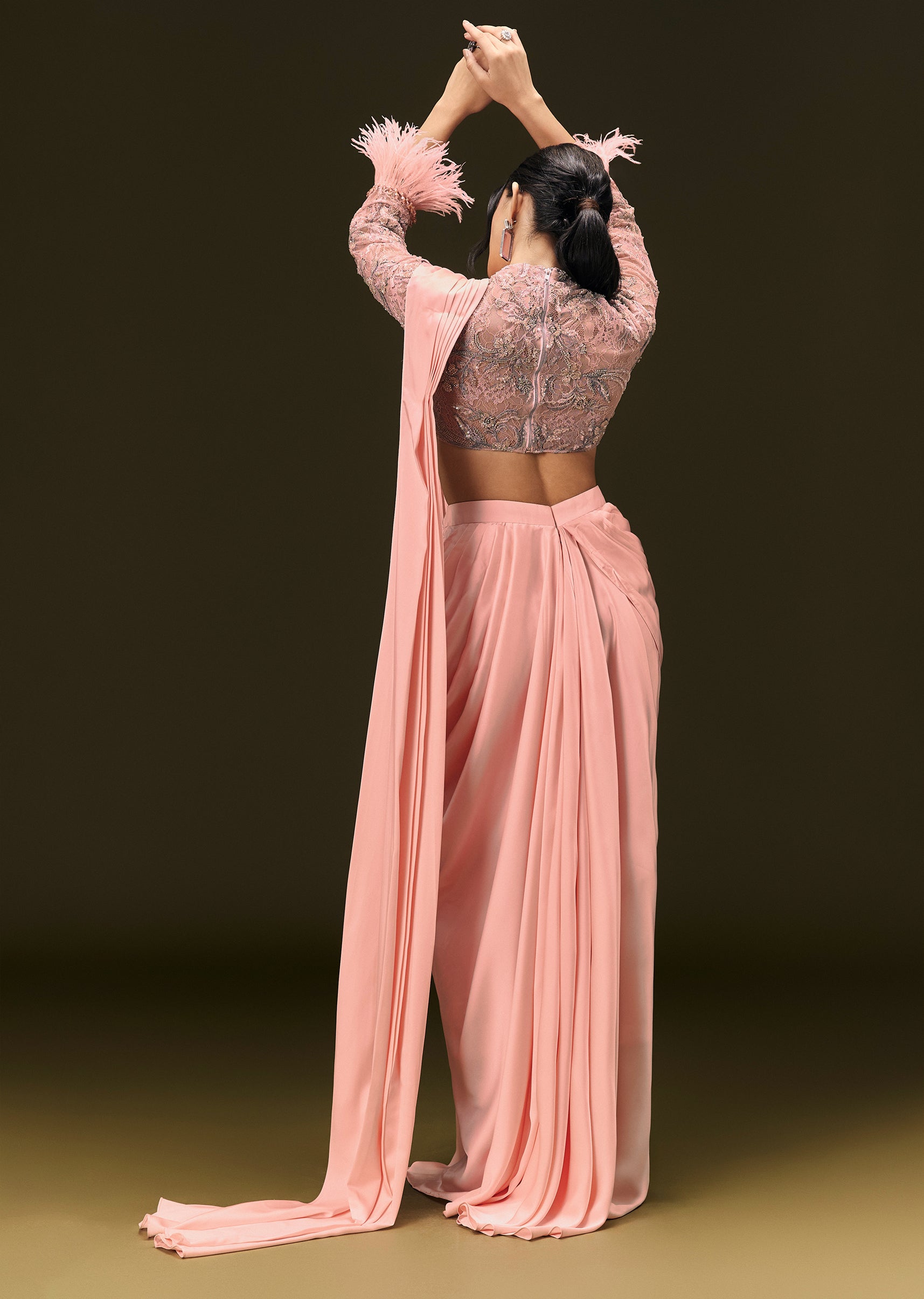Baby Pink Ready To Wear Satin Saree With High Neck Full Sleeve Blouse