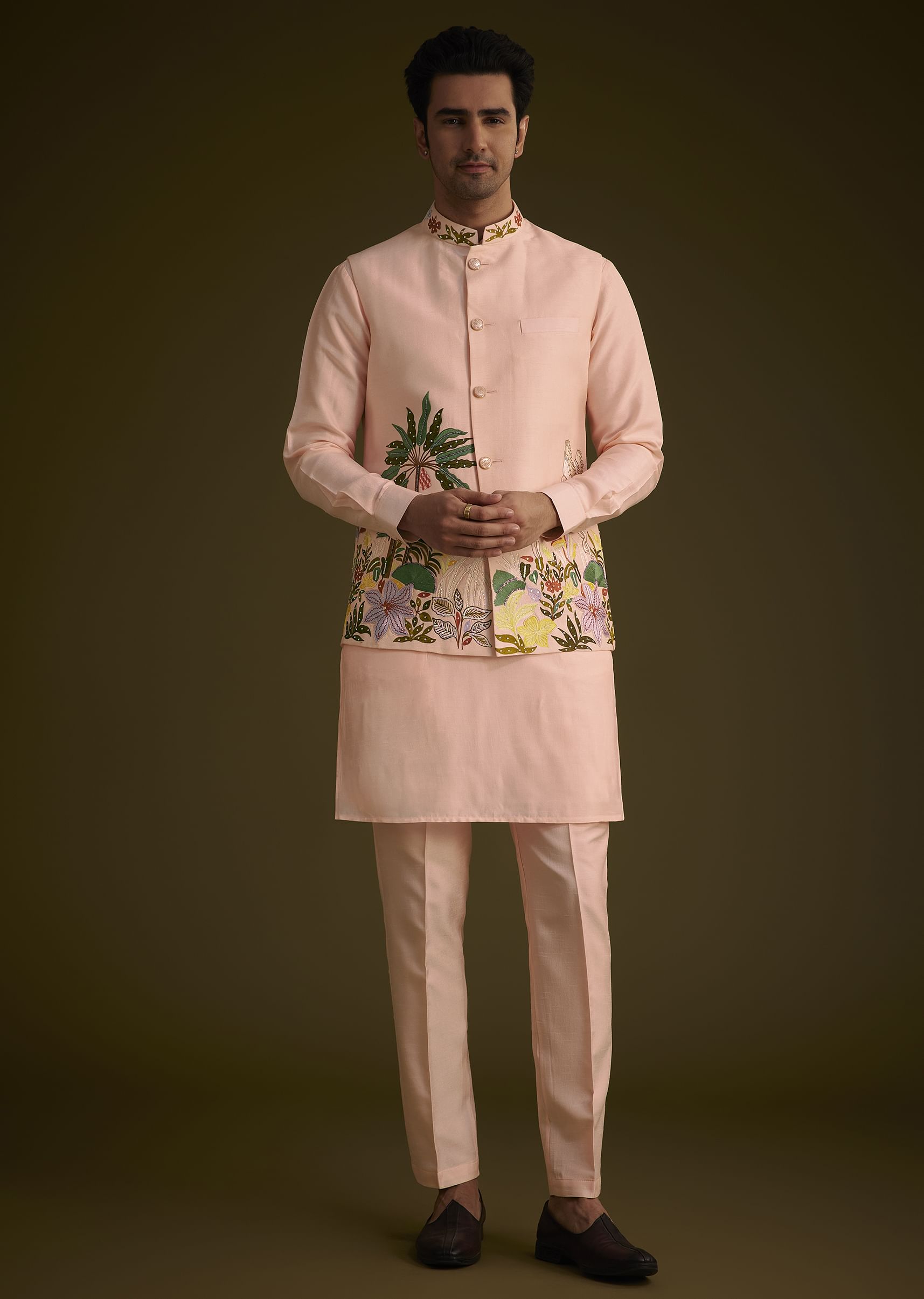 Add A Fresh Touch To Your Festive Wardrobe With This Baby Pink Silk Jacket Set, Featuring A Nature-Inspired Patchwork Design Adorned With Subtle Sequin Highlights. The Intricate Detailing On The... More Product Details