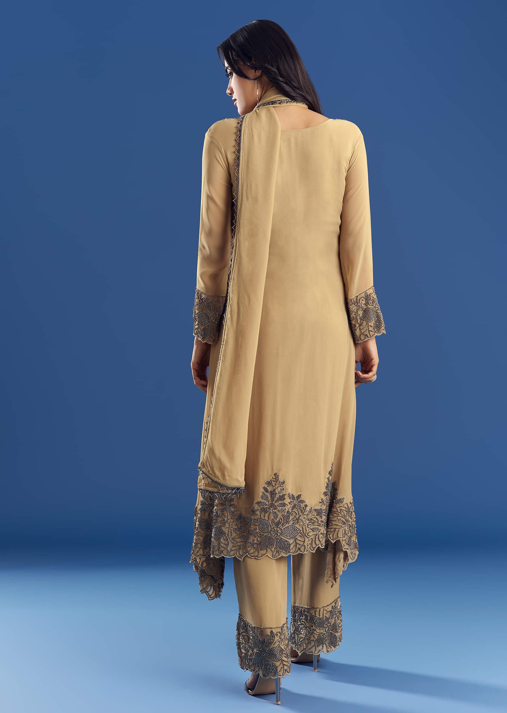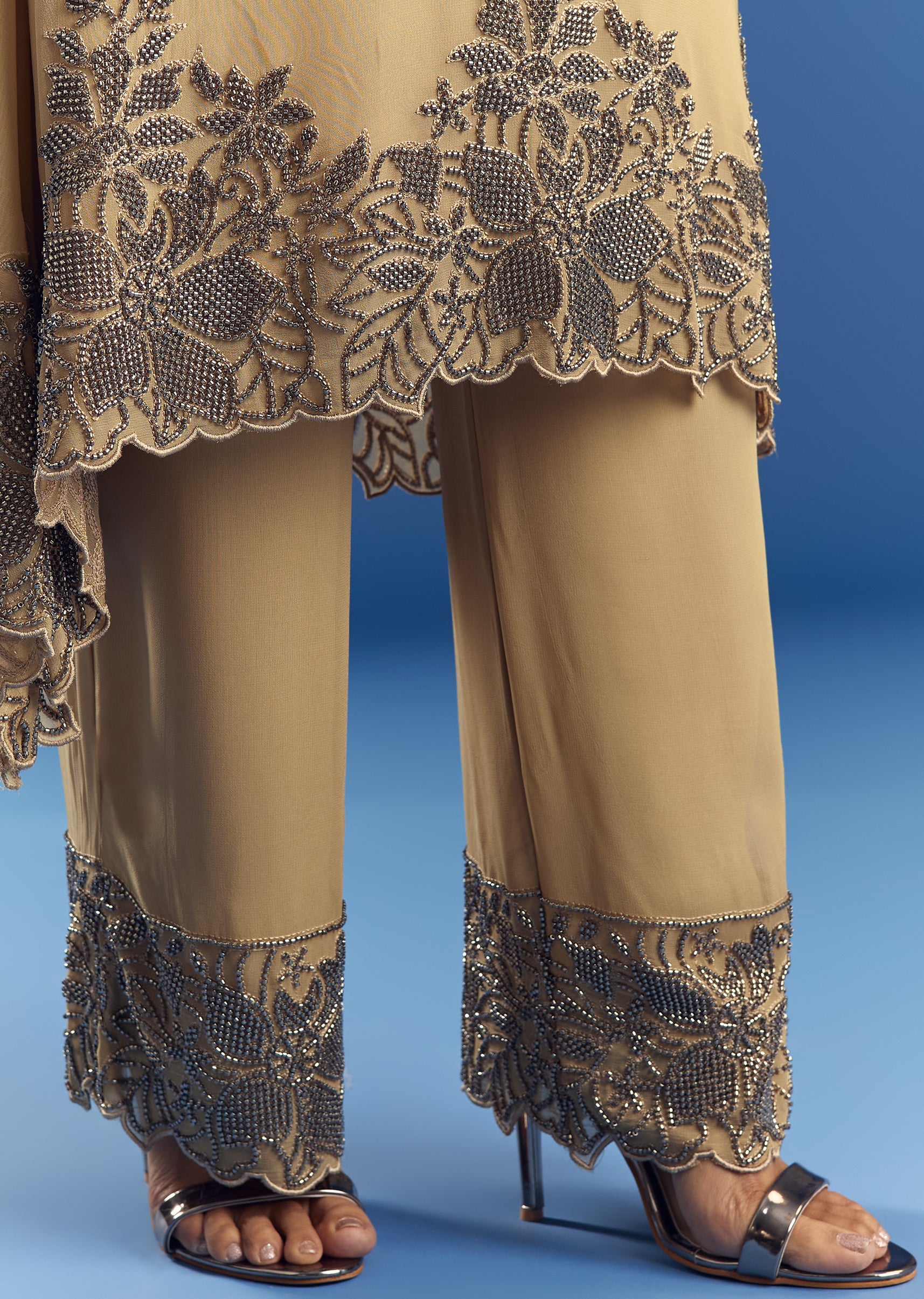 Beige Asymmetrical Georgette Beaded Kurta Pant Set With Dupatta