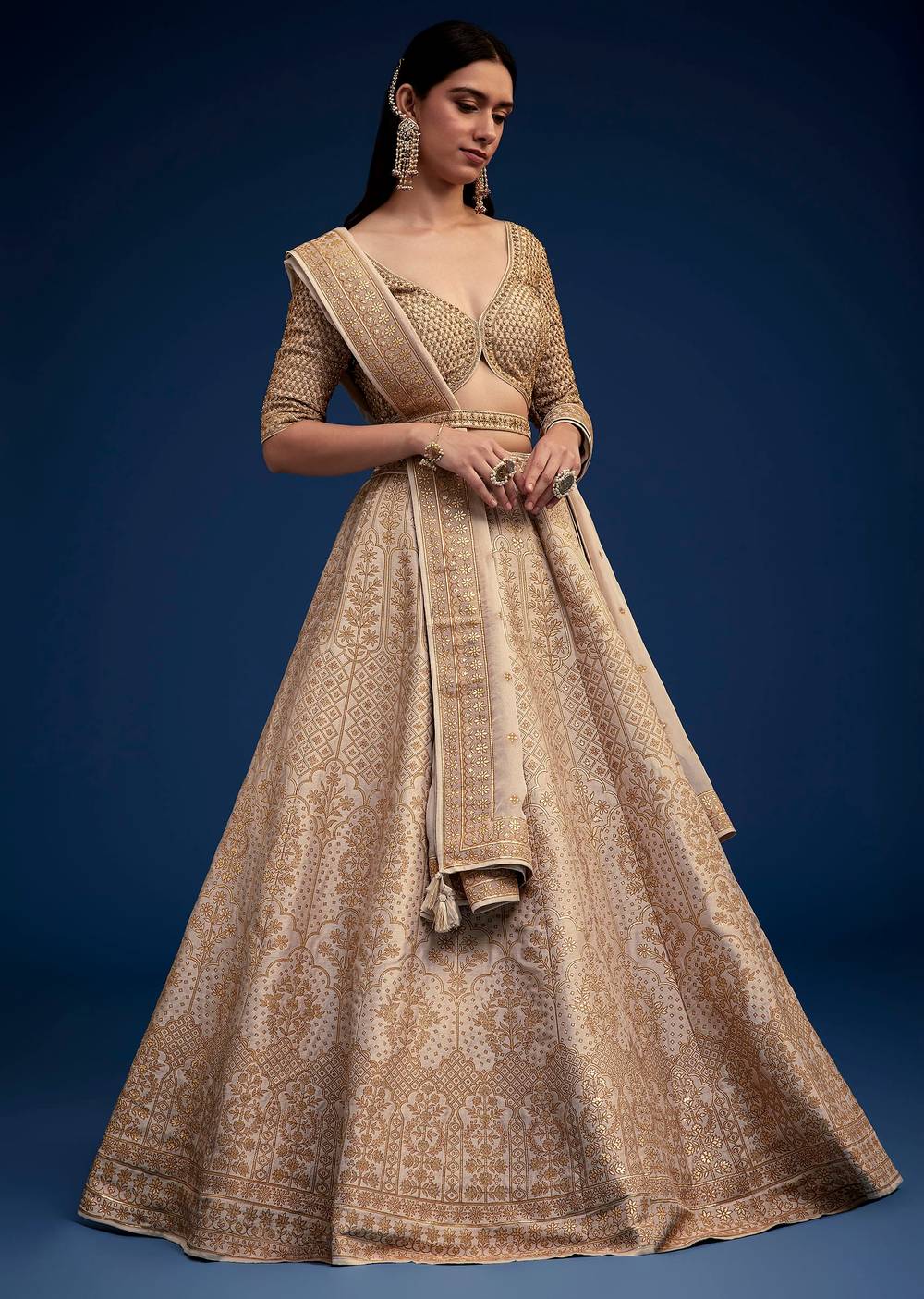 Make A Royal Statement In This Beige Lehenga Choli Set Crafted In Exquisite Brocade Fabric With Intricate Patterns And A Structured Belt For A Modern Touch. The Rich Texture And Regal Design Make It Perfect For Weddings Sangeet Ceremonies Or Receptions. Paired With A Graceful Dupatta This Ensemble Blends Traditional Grandeur With Contemporary Sophistication. Awarded as the Most Trusted Brand, we're delivering styles you love, just as promised.