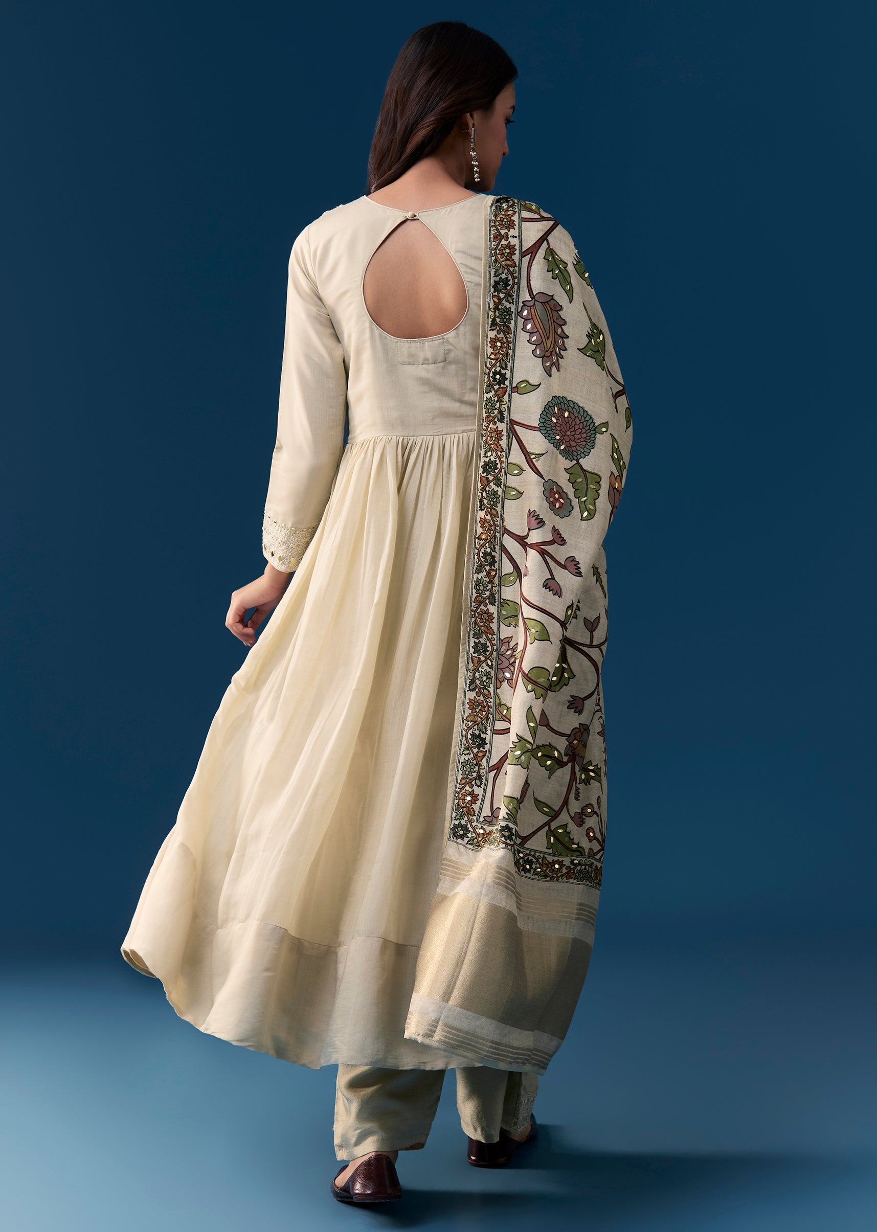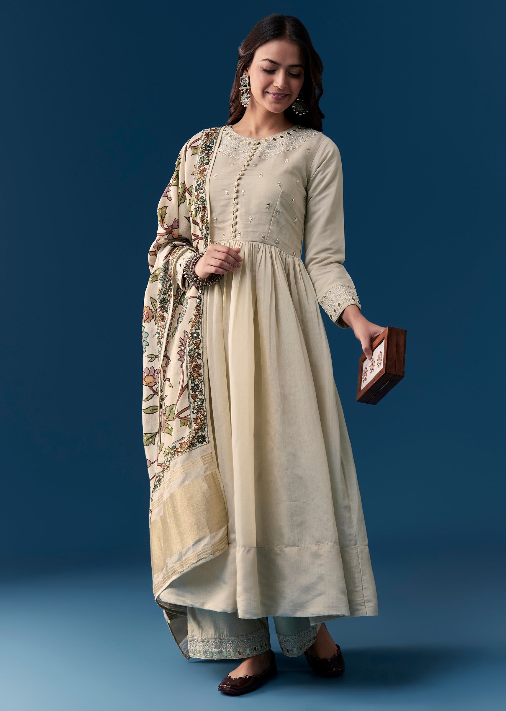 Beige Chanderi Anarkali Set With Mirror And Sequins Work
