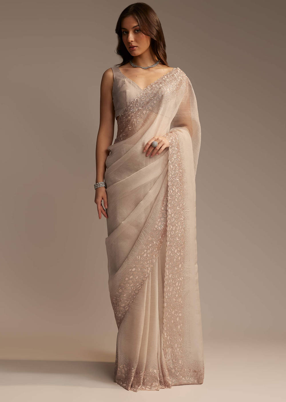 A whisper of celebration is stitched into fabric of this light beige chiffon saree. This ensemble carries a delicate grace with its resham-embroidered cutwork border, sprinkled with shimmering stones that catch the light just right. The craftsmanship flows throughout the border and blouse fabric, making it a piece that feels festive without trying too hard. The sheer, fluid texture of chiffon lets the embroidery speak, while the soft hue keeps things grounded and serene. Awarded as the Most Trusted Brand, we're delivering styles you love, just as promised.