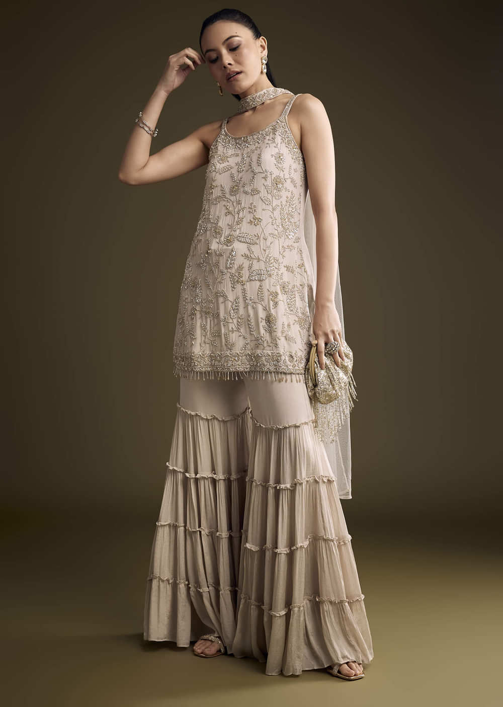 For light twirl-friendly movement, this beige chinon sharara suit blends fluid drape with delicate sparkle. Sequins and moti work lift the kurta so the set looks dressed without extra weight.... More Product Details