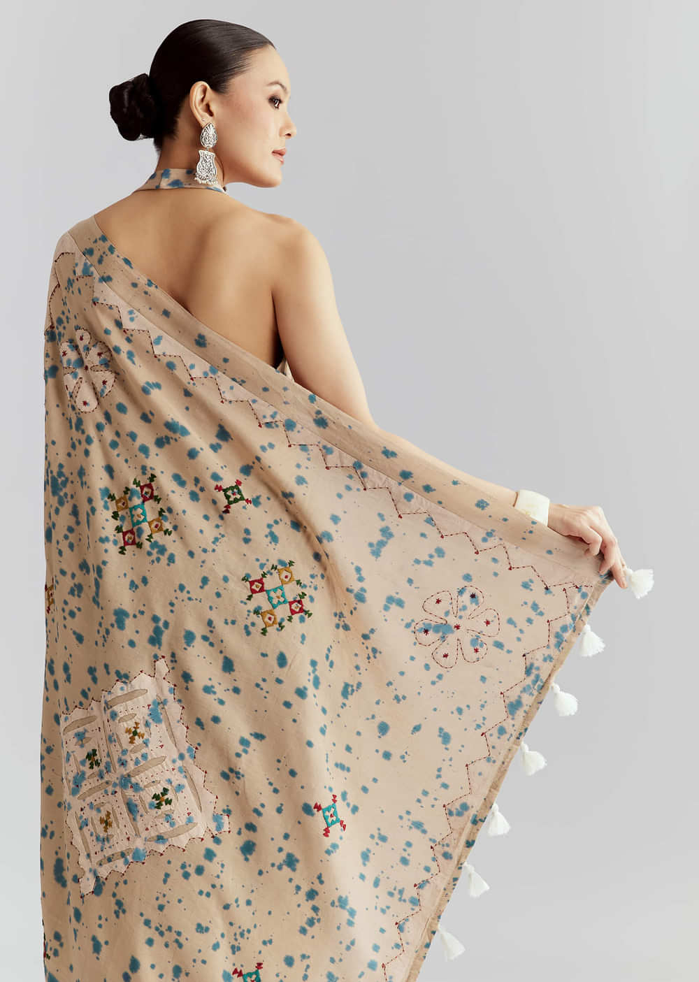 Beige Cotton Linen Saree With Hand Block Print And Kantha Work