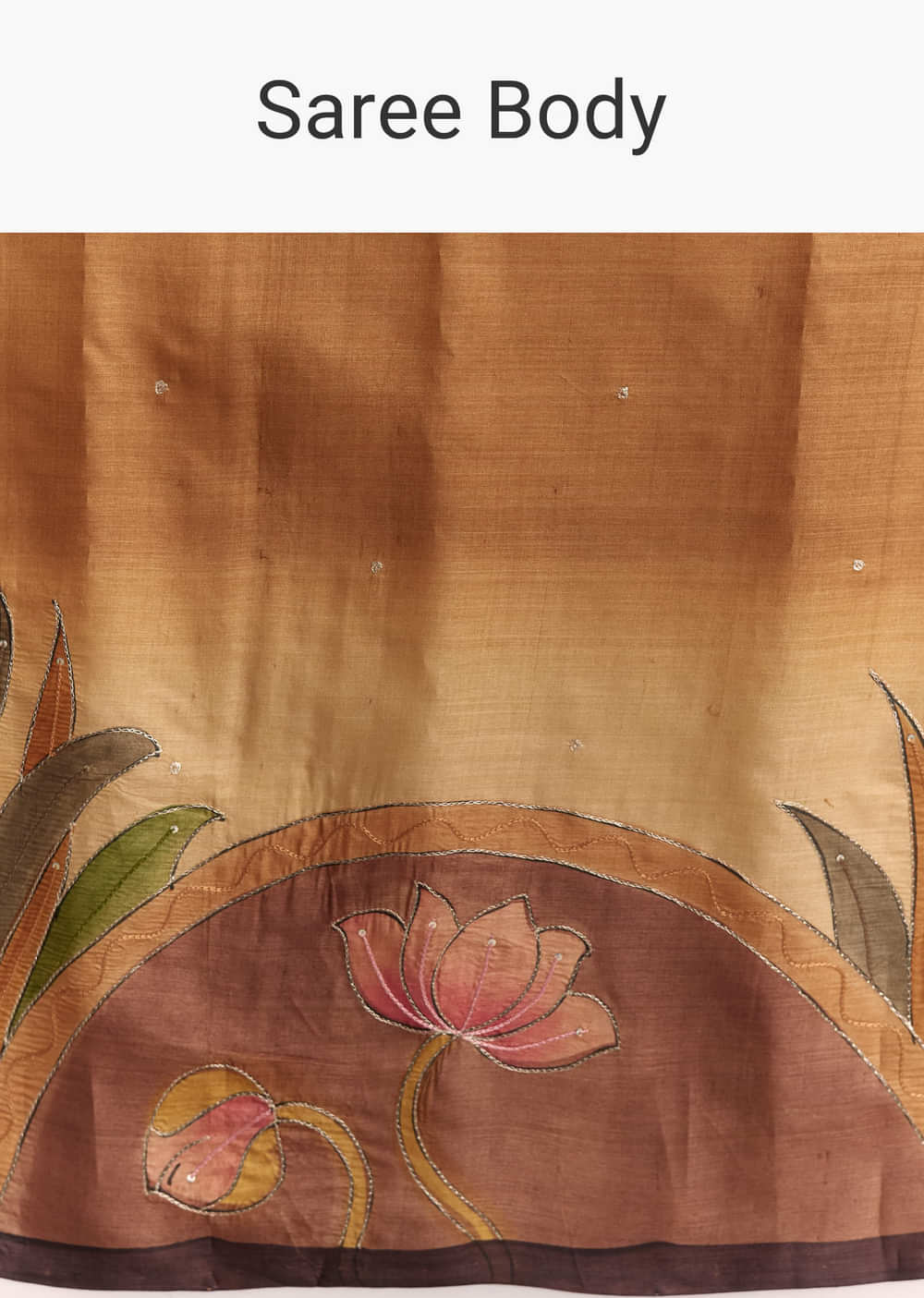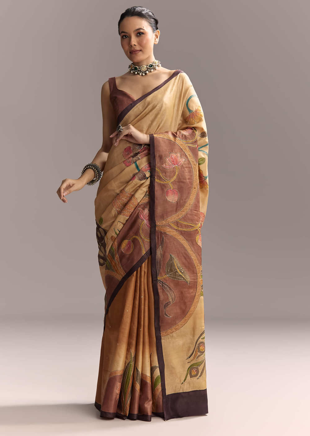 Beige and brown shades make the perfect canvas for this cotton saree featuring authentic hand painted peacocks, flowers, and nature-inspired motifs. Kantha stitches highlight the artwork, giving it more depth.... More Product Details