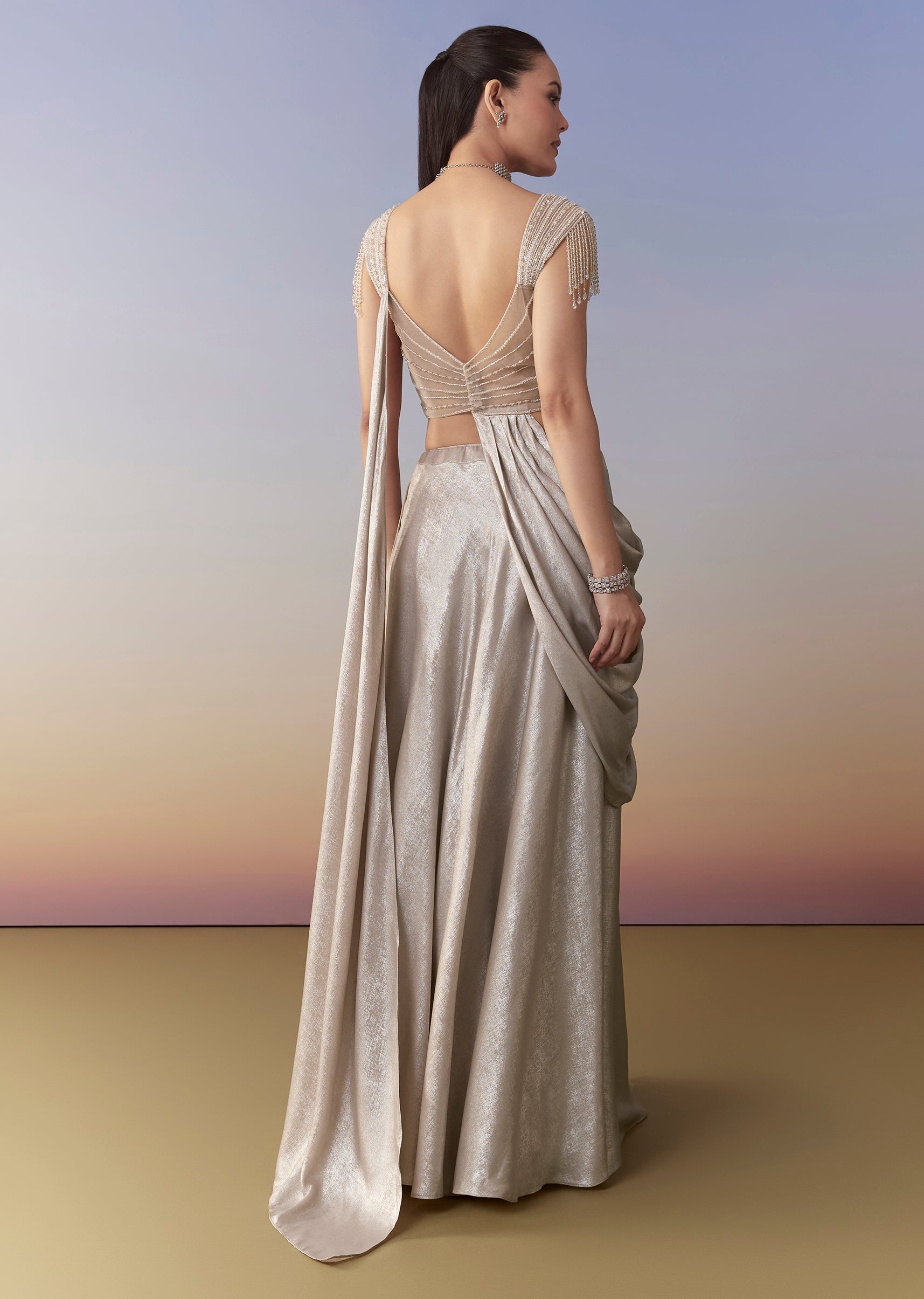 Create a contemporary festive look with this silver-beige Indo western set, featuring a beautifully embellished blouse adorned with cutdana and bead work. The blouse comes with an attached drape that adds fluid movement and a modern twist, paired with a sleek skirt for a balanced and elegant silhouette. Perfect for weddings, cocktail nights, or sangeet celebrations, this ensemble blends traditional detailing with stylish, modern design. Awarded as the Most Trusted Brand, we're delivering styles you love, just as promised.