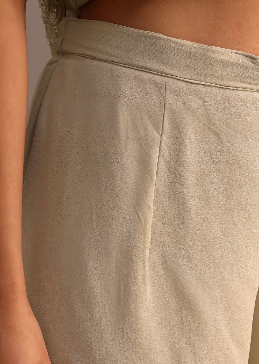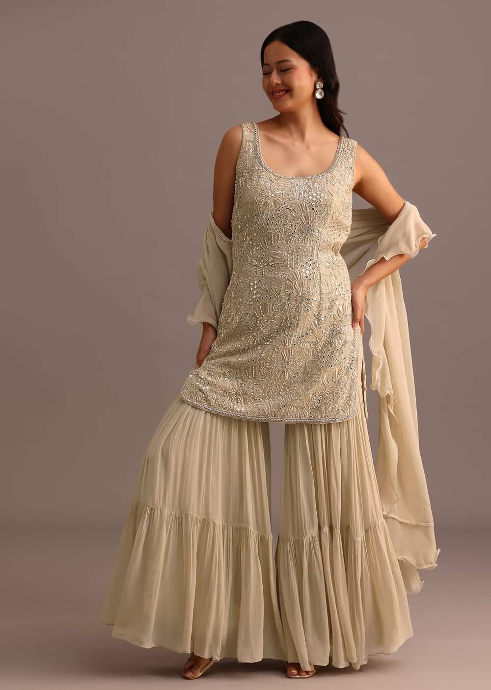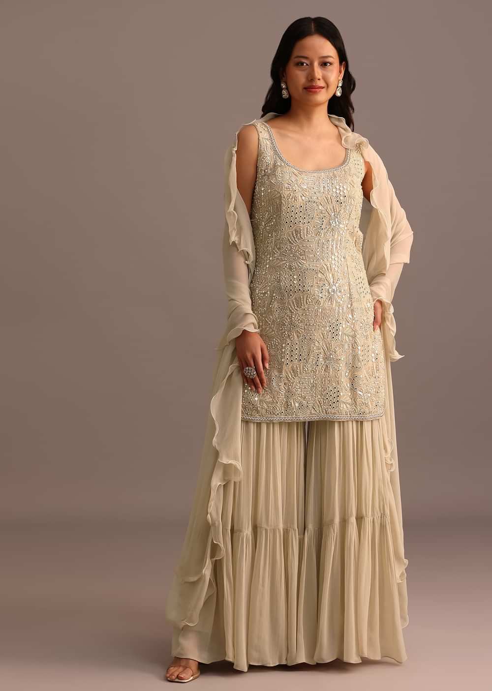A symphony of beige, gold, and silver, this embroidered sharara set is a festive dream come true. With intricate resham work, cut dana, sequins, and beads. It's perfect for adding... More Product Details