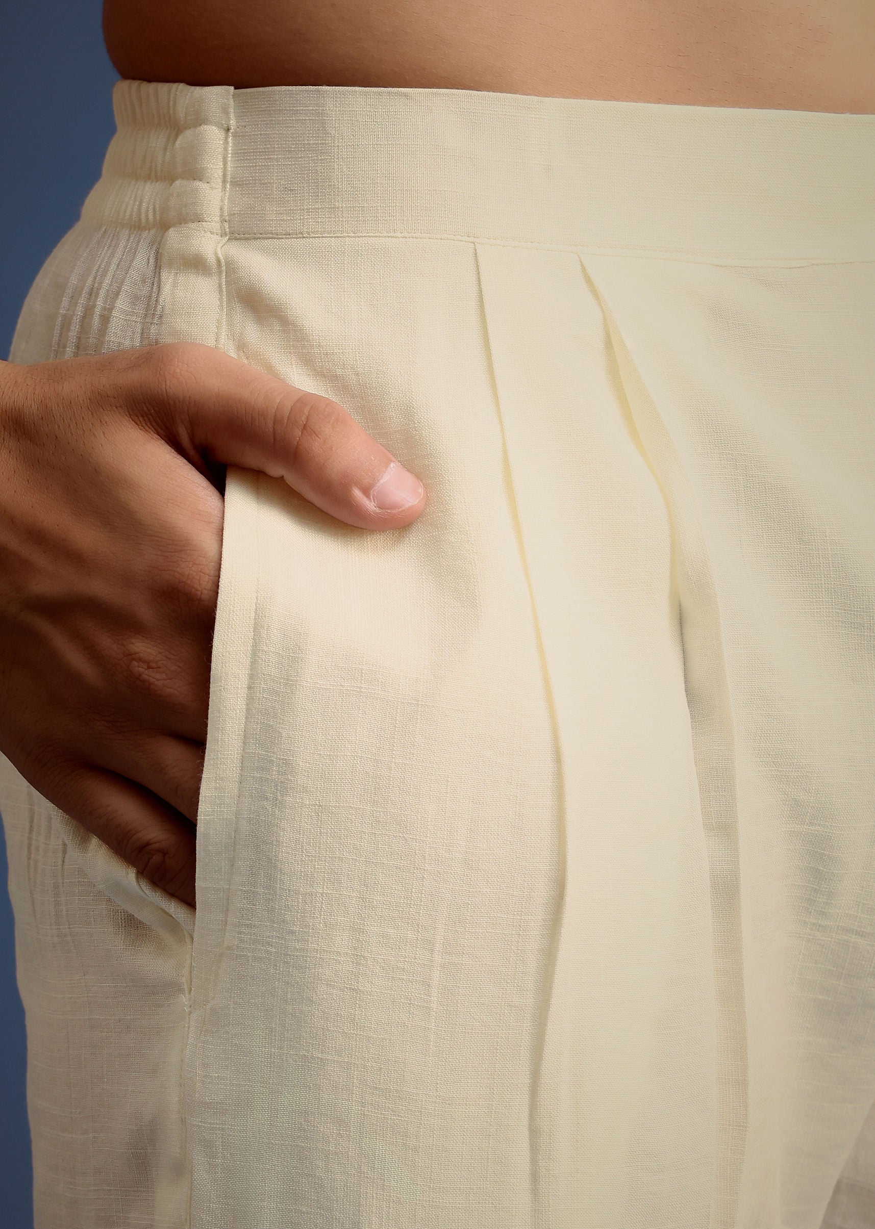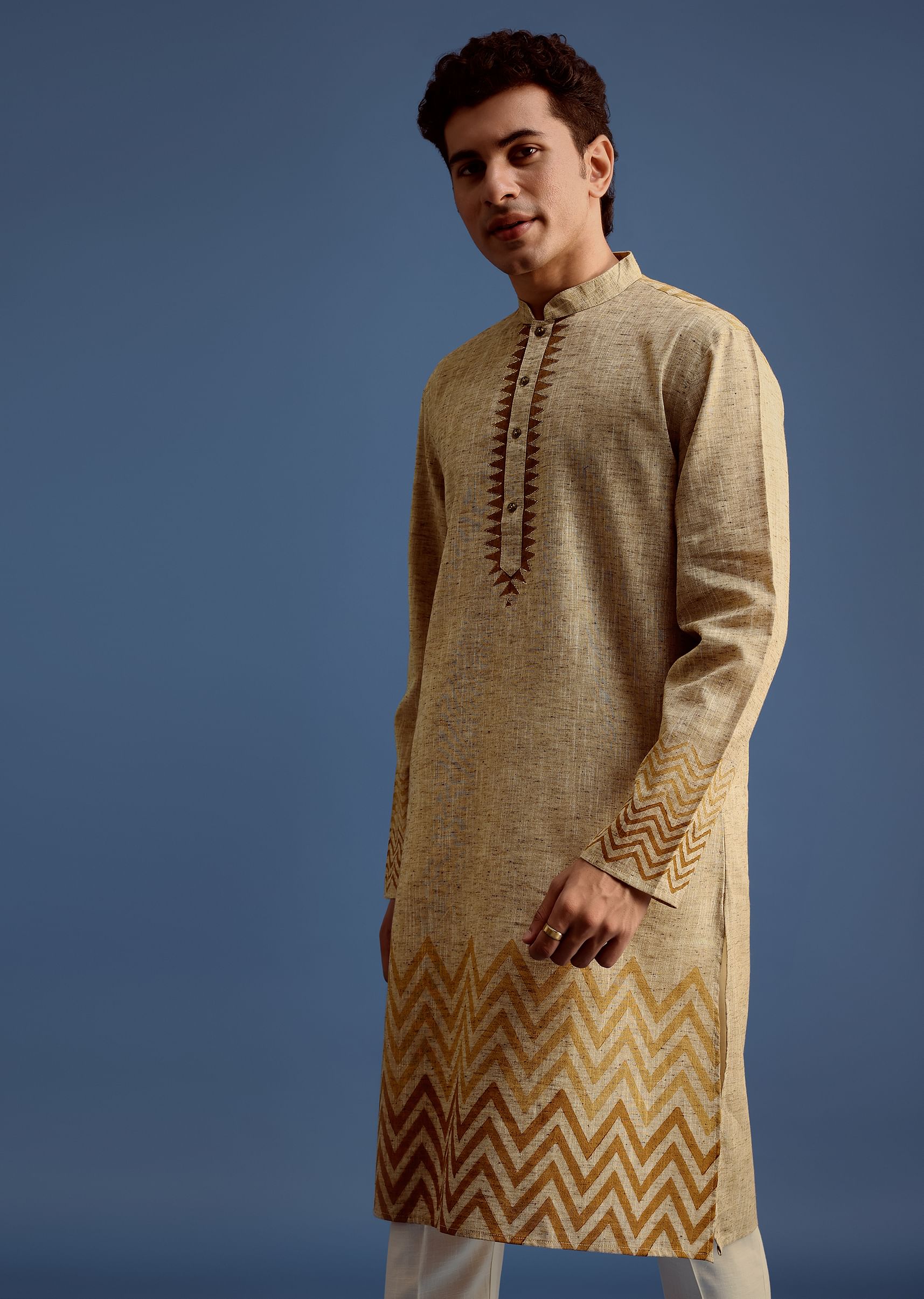 - Celebrate the exquisite artistry of Indian craftsmanship with our beige hand block printed kurta set adorned with intricate zari hand embroidery.