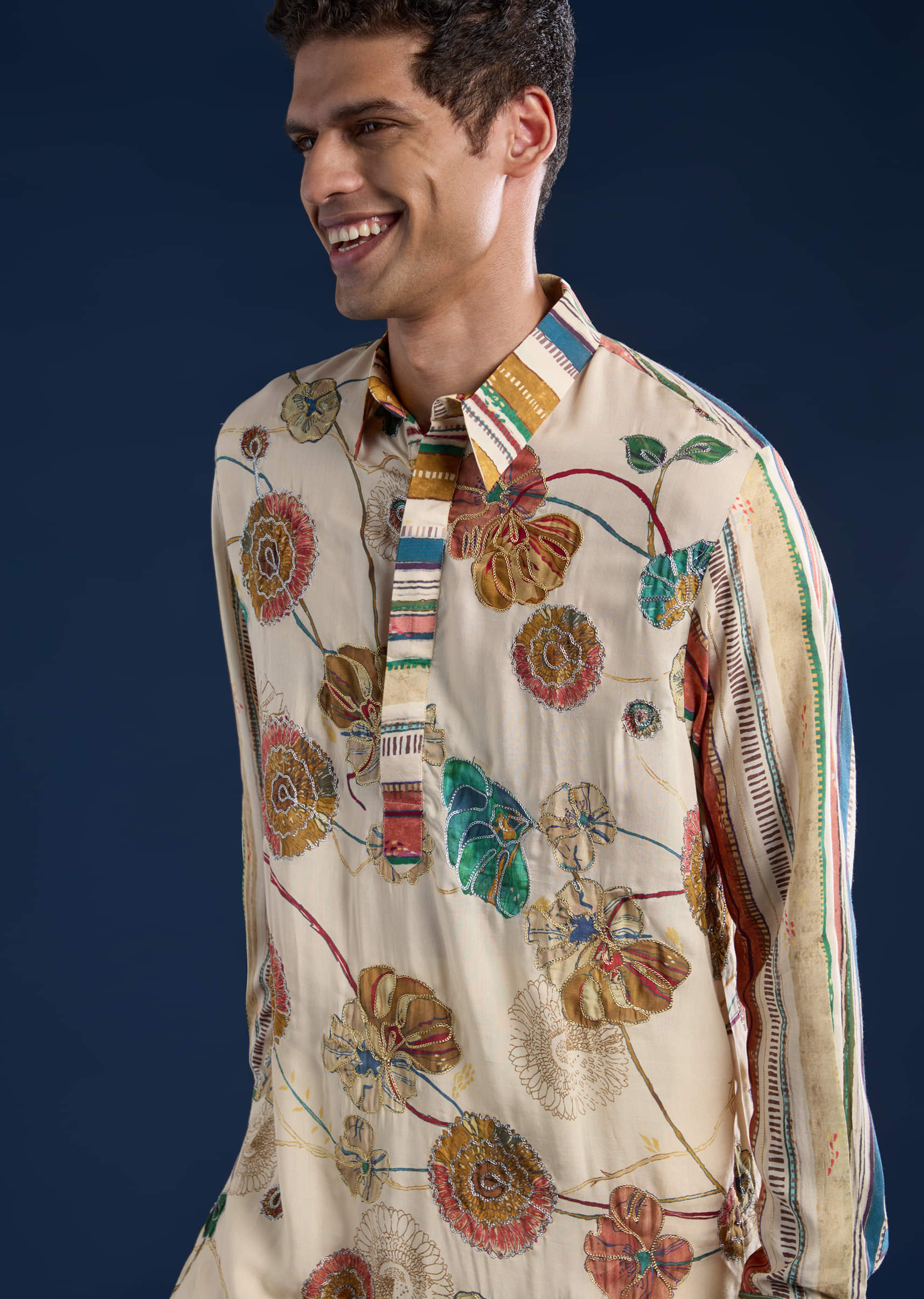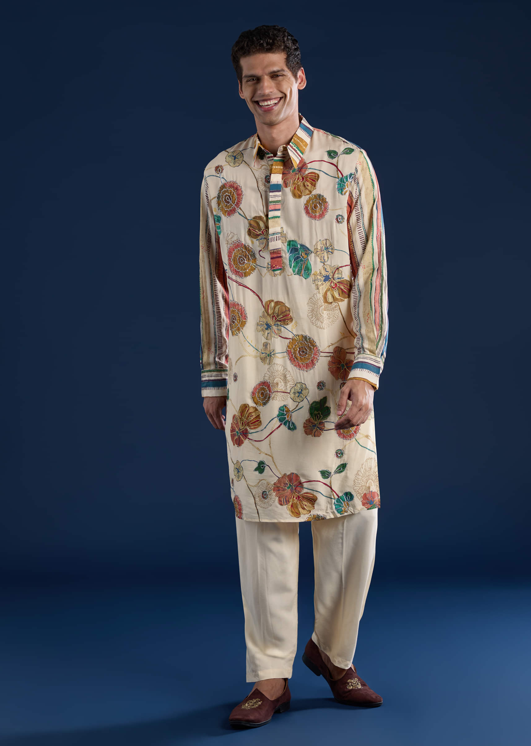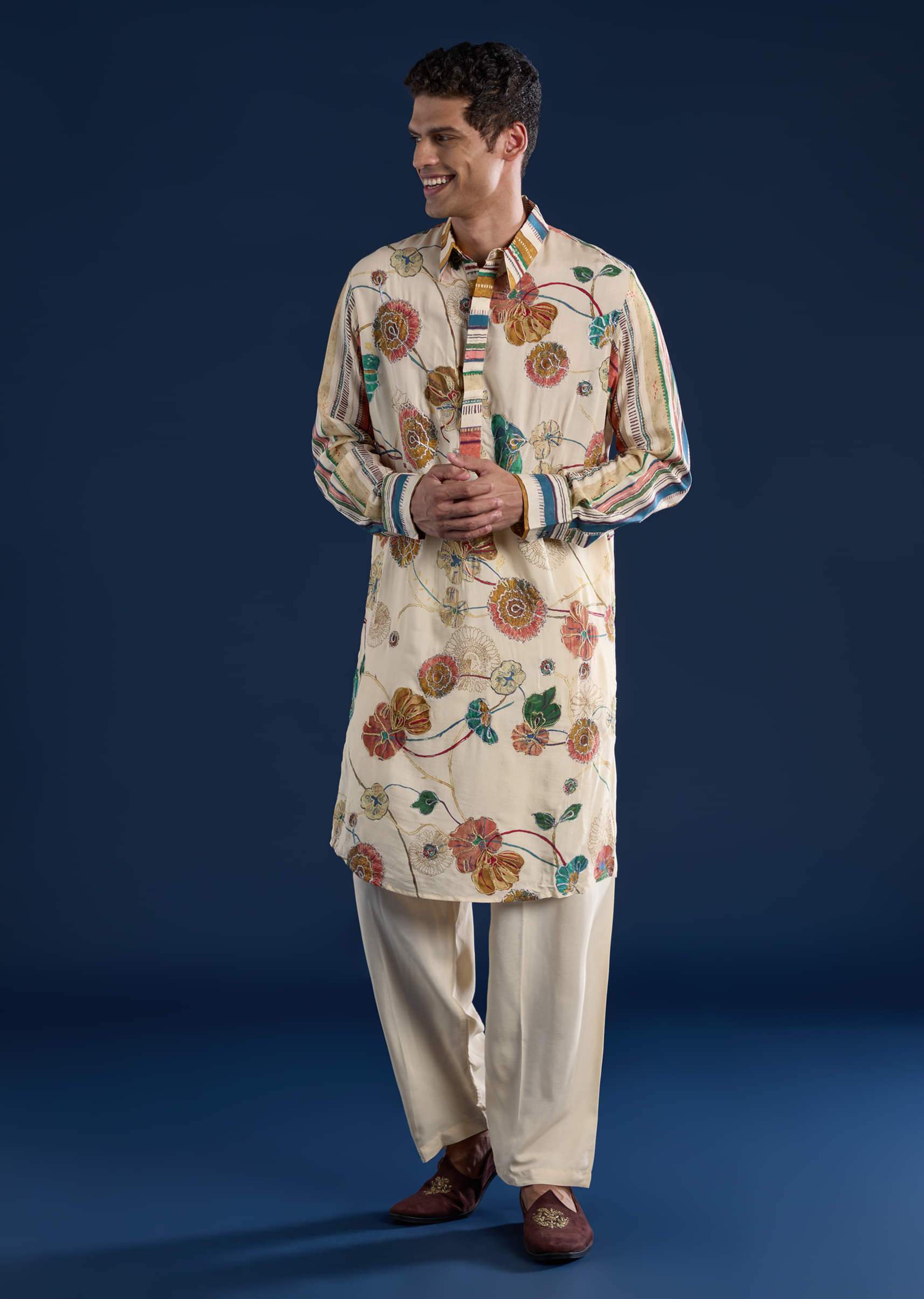 Beige Kalamkari Print Mens Kurta and Pant Set