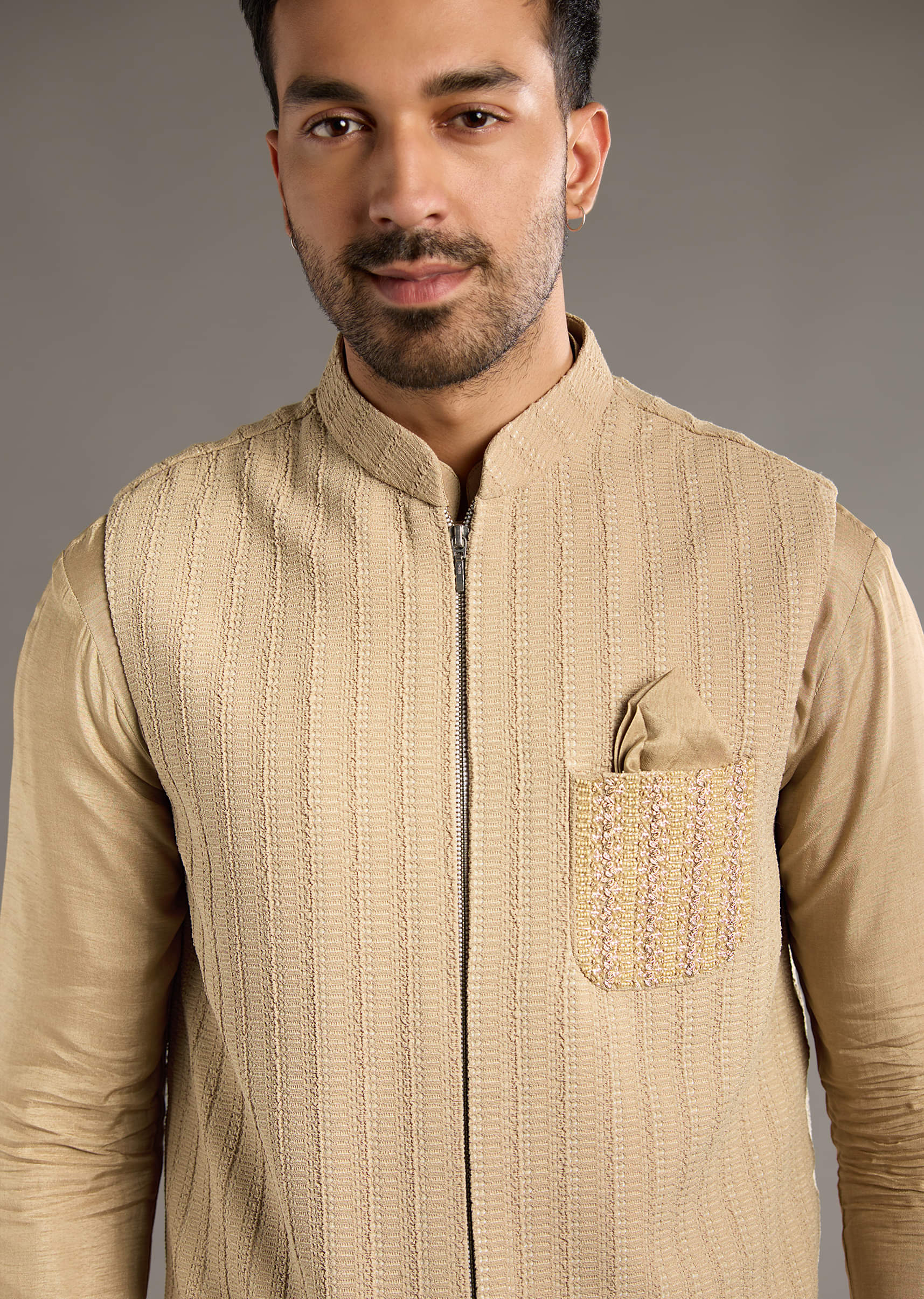 Beige Kurta Jacket Set For Men With Beads And Resham Work