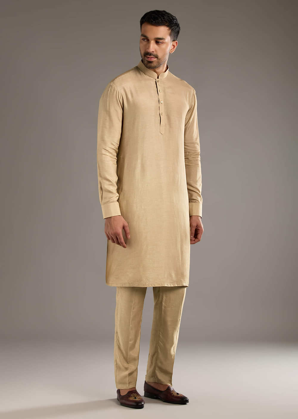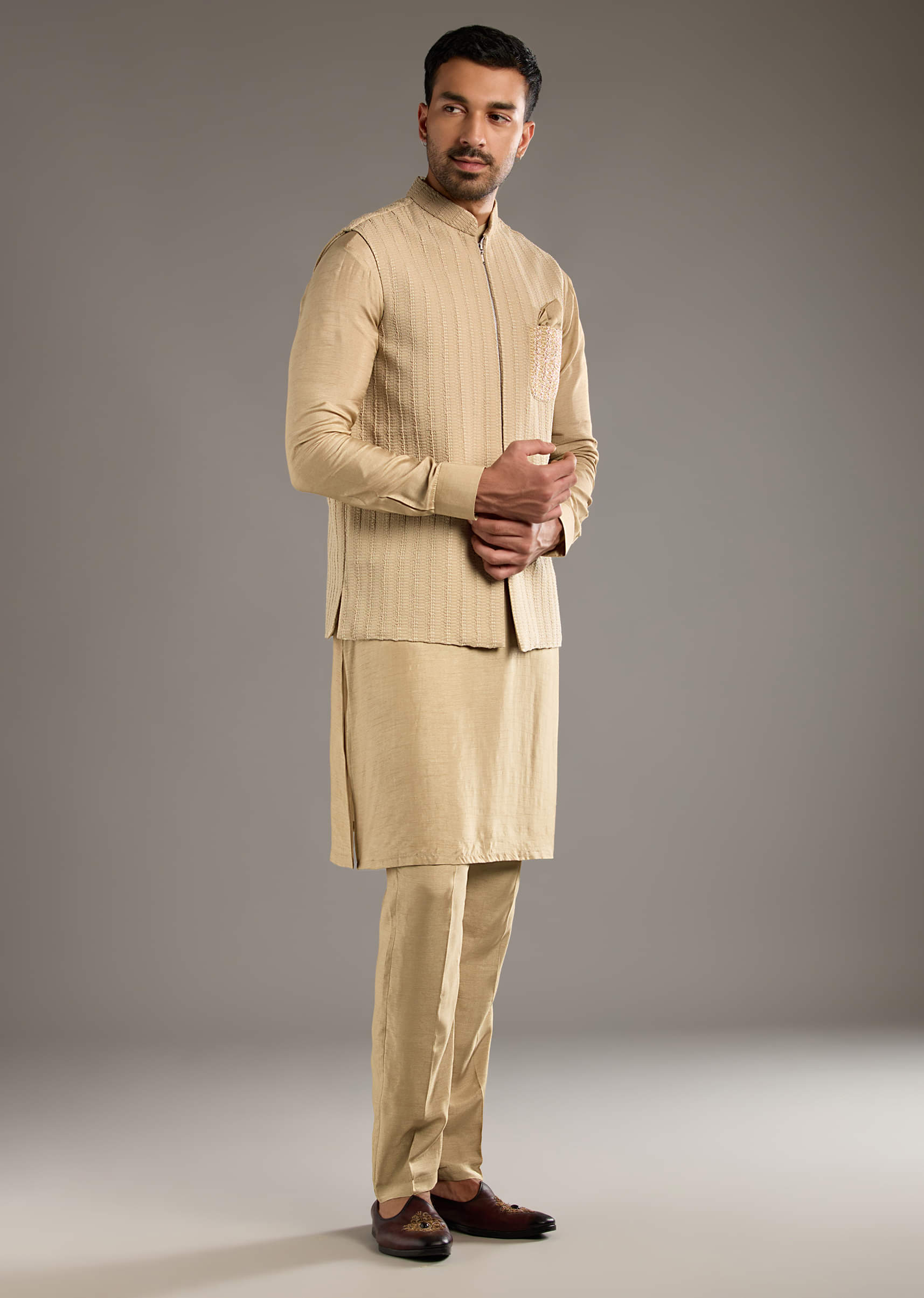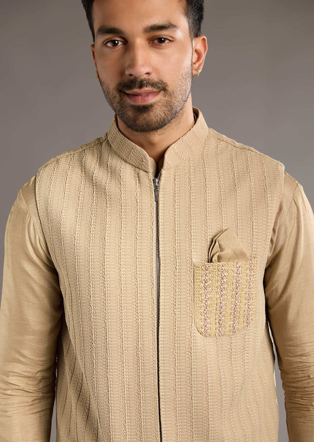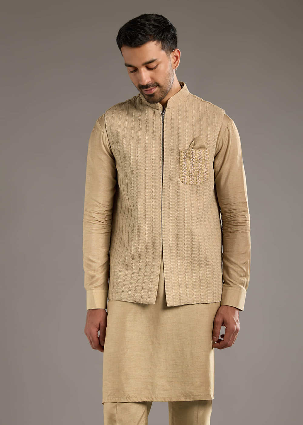Subtle sparkle arrives when this beige men’s kurta jacket set in knit fabric blends tiny beads with resham stitches for a refined surface. The neutral base keeps styling easy from day to night. You feel polished and wedding-ready without going heavy. Awarded as the Most Trusted Brand, we're delivering styles you love, just as promised.