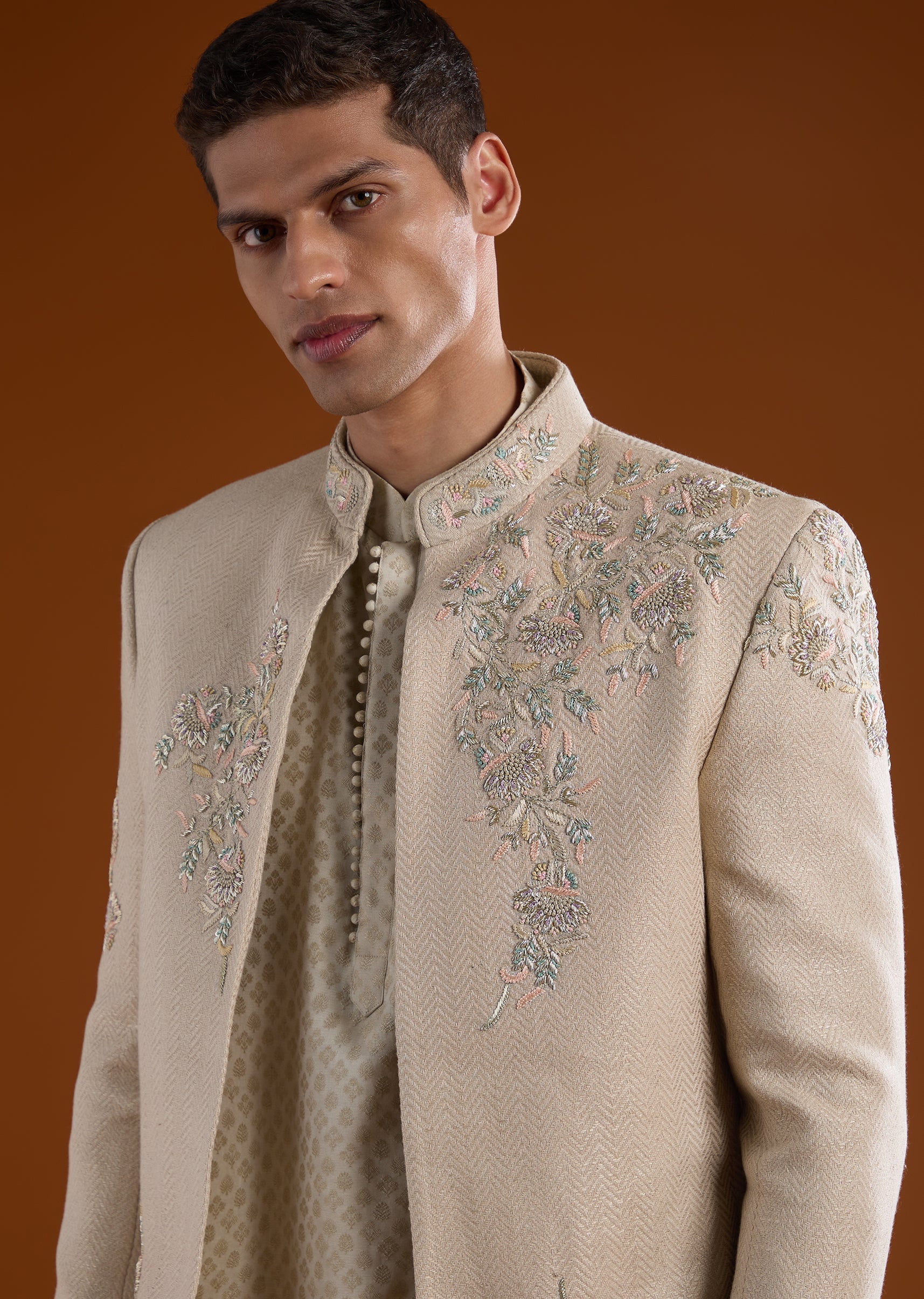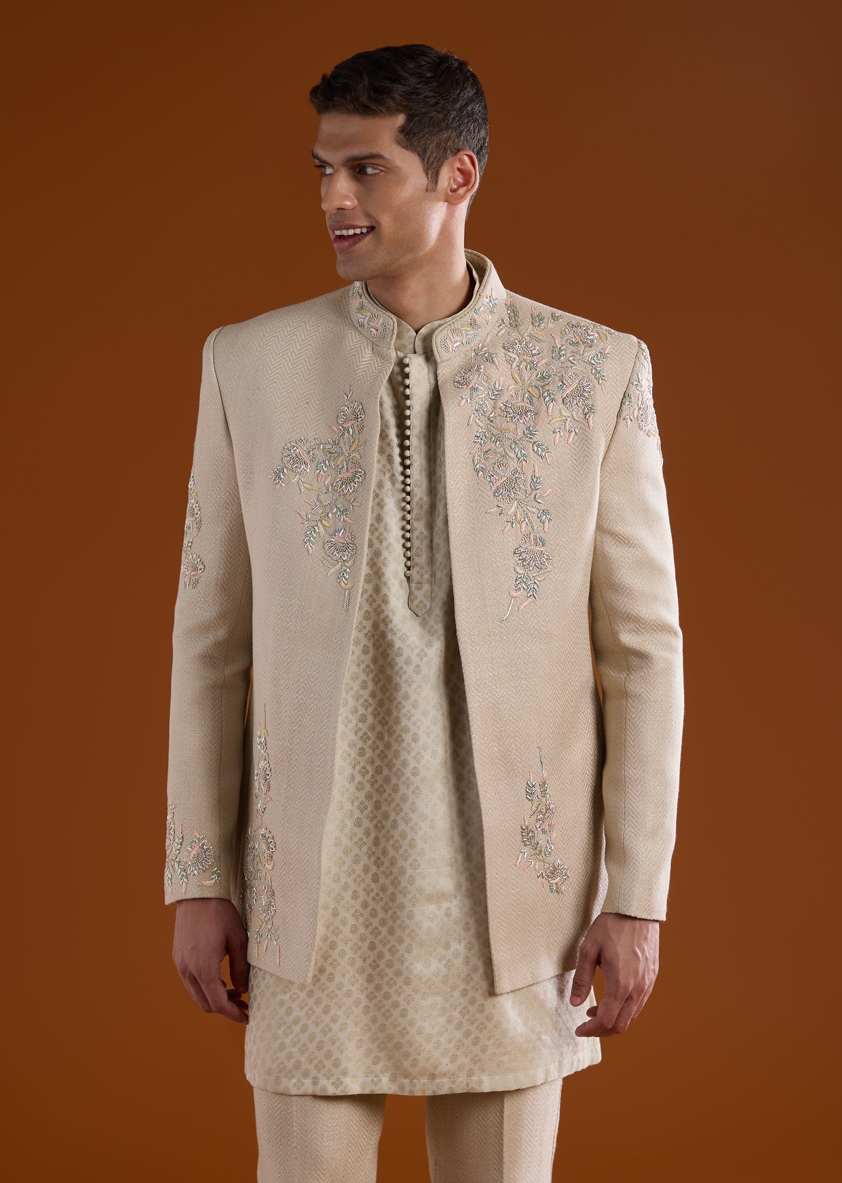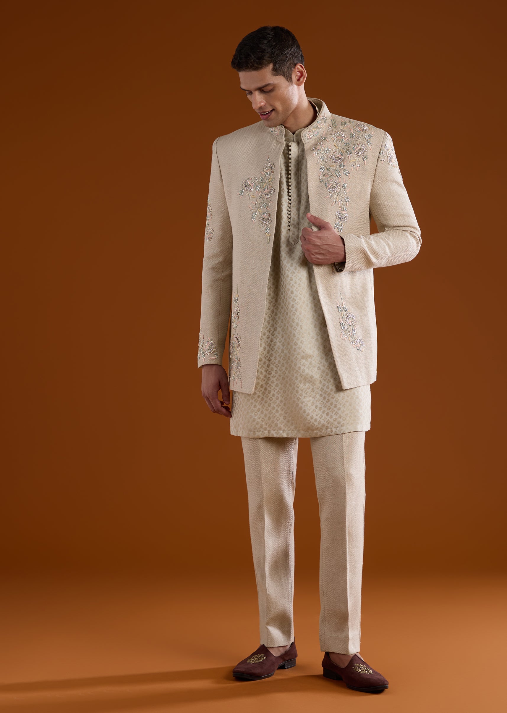 Beige Kurta Jacket Set With Thread Sequins And Cut Dana Work