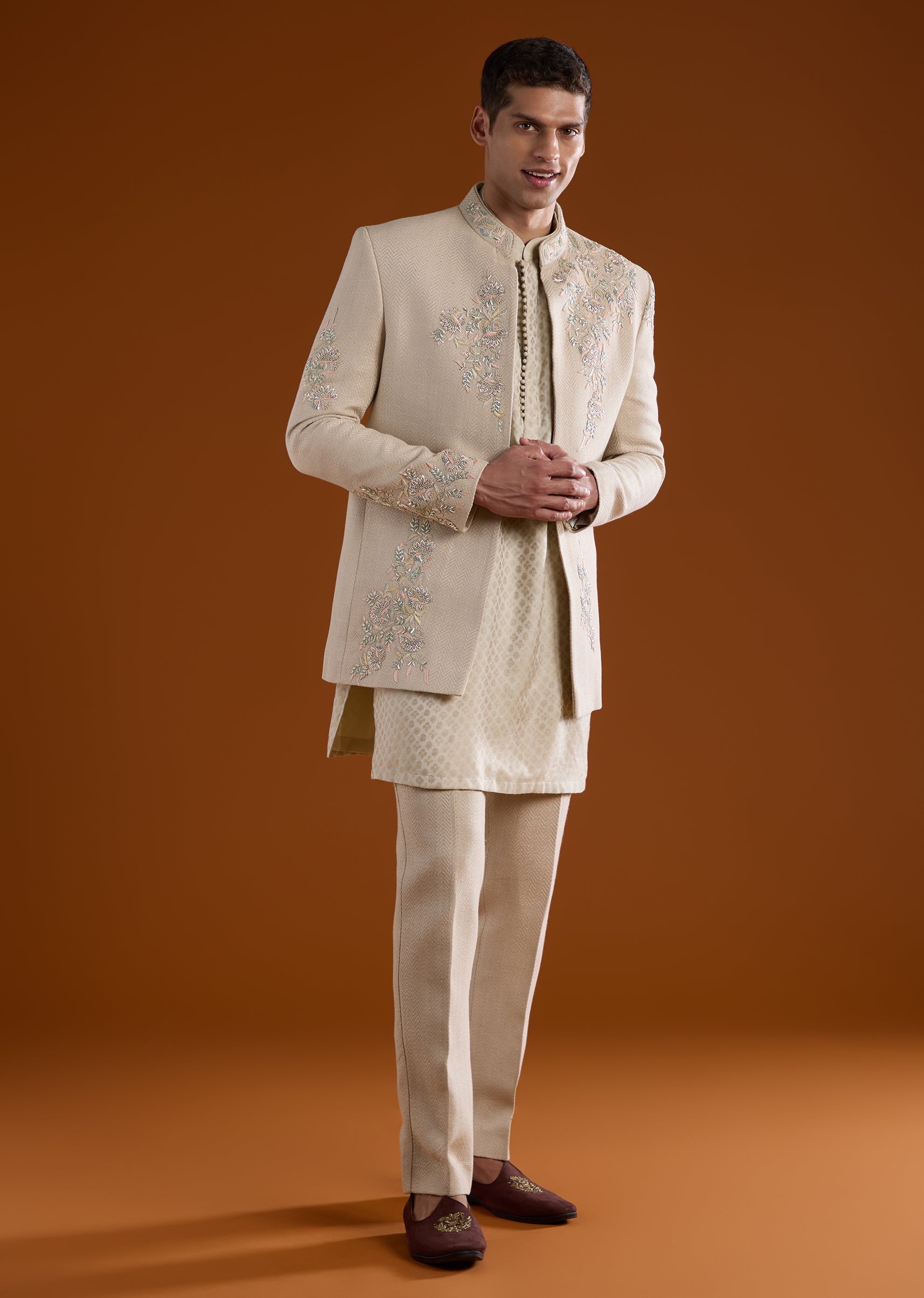 An elegant choice for wedding, engagement, and sangeet celebrations, this beige kurta jacket set is designed for the groom’s brother or groomsman. Detailed with refined thread, sequins, and cut Dana... More Product Details