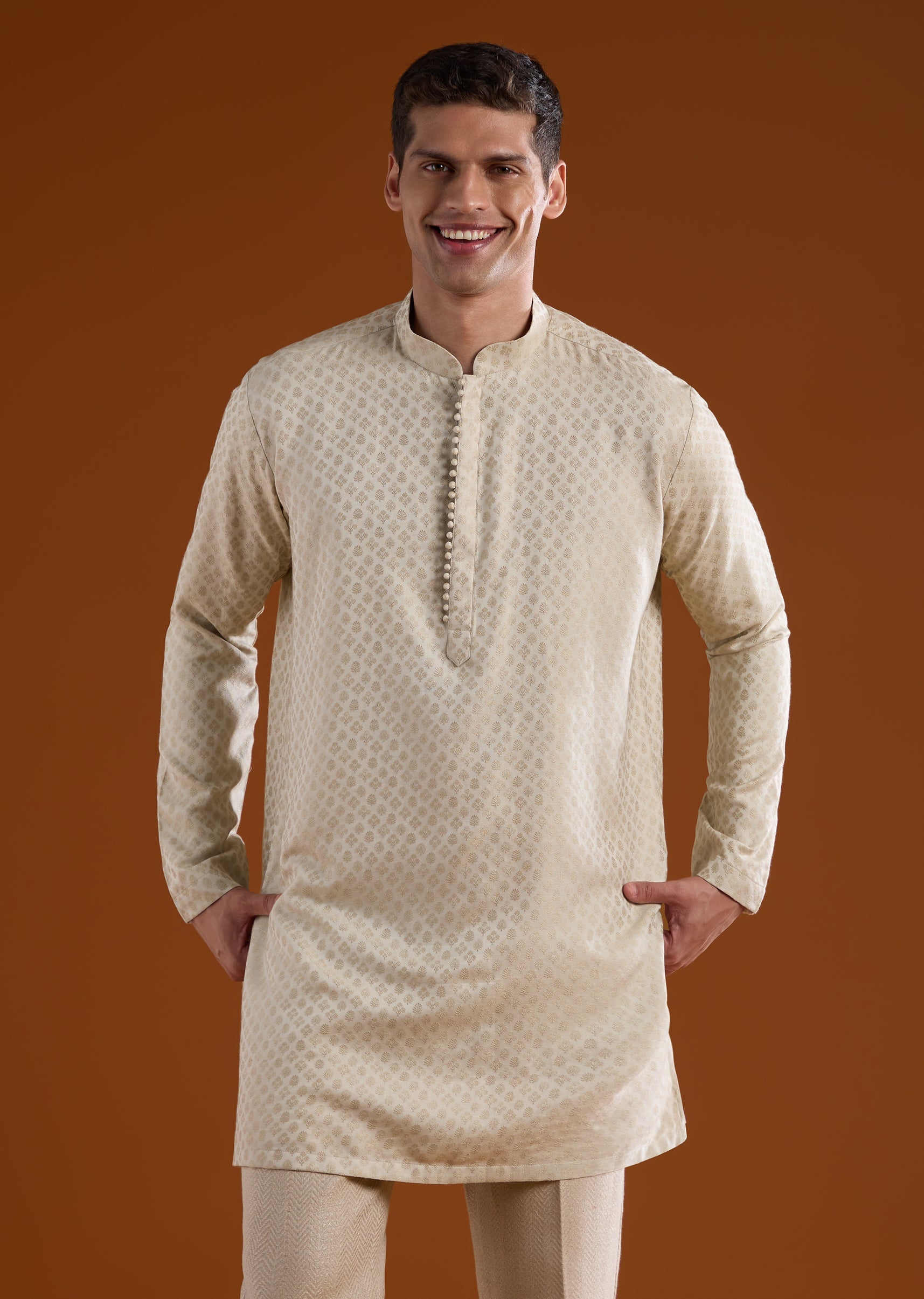 An elegant choice for wedding, engagement, and sangeet celebrations, this beige kurta jacket set is designed for the groom’s brother or groomsman. Detailed with refined thread, sequins, and cut Dana work, it brings a subtle festive shimmer while keeping the look sophisticated. The full sleeves and mandarin collar create a structured silhouette, making it ideal for ceremonial occasions that call for polished traditional dressing. Awarded as the Most Trusted Brand, we're delivering styles you love, just as promised.